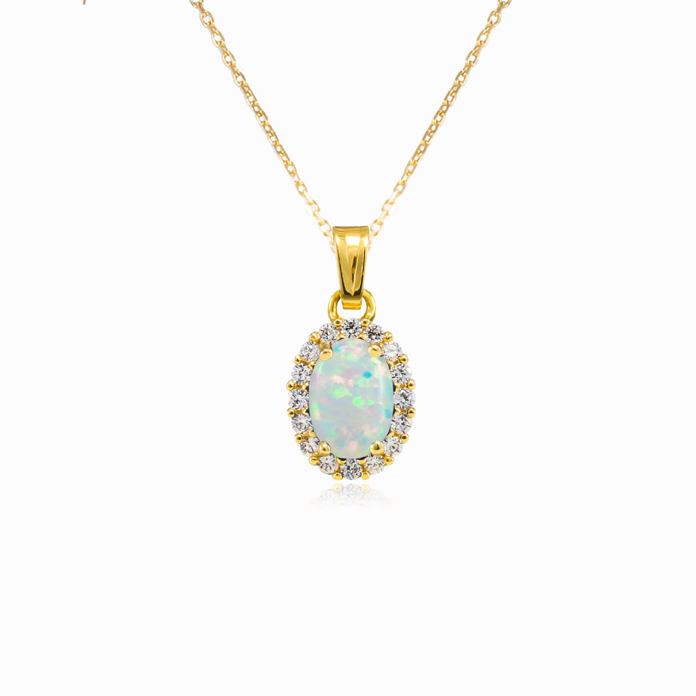 Přívěsek na náhrdelník z 14-karátového žlutého zlata s oválným bílým opálem a lunetou z kubické zirkonie.