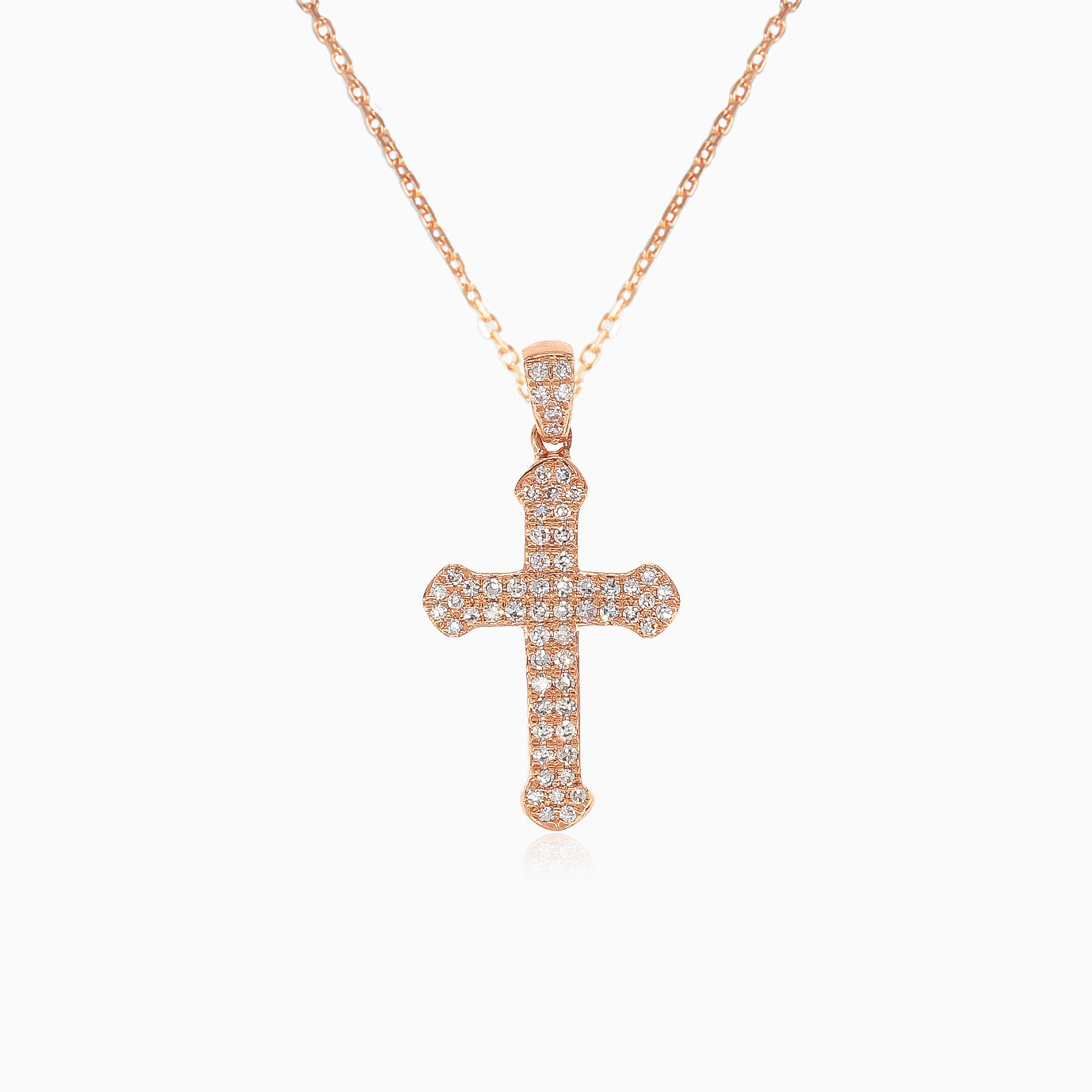 Dodejte svému outfitu nádech elegance s naším přívěskem pravoslavného kříže pro ženy. Tento přívěsek je vyroben ze 14kt růžového zlata a je osazen kulatými diamanty jemného stupňovitého brusu, které jsou zasazeny do jemného zářezu a vytvářejí tak úžasný a nadčasový šperk.