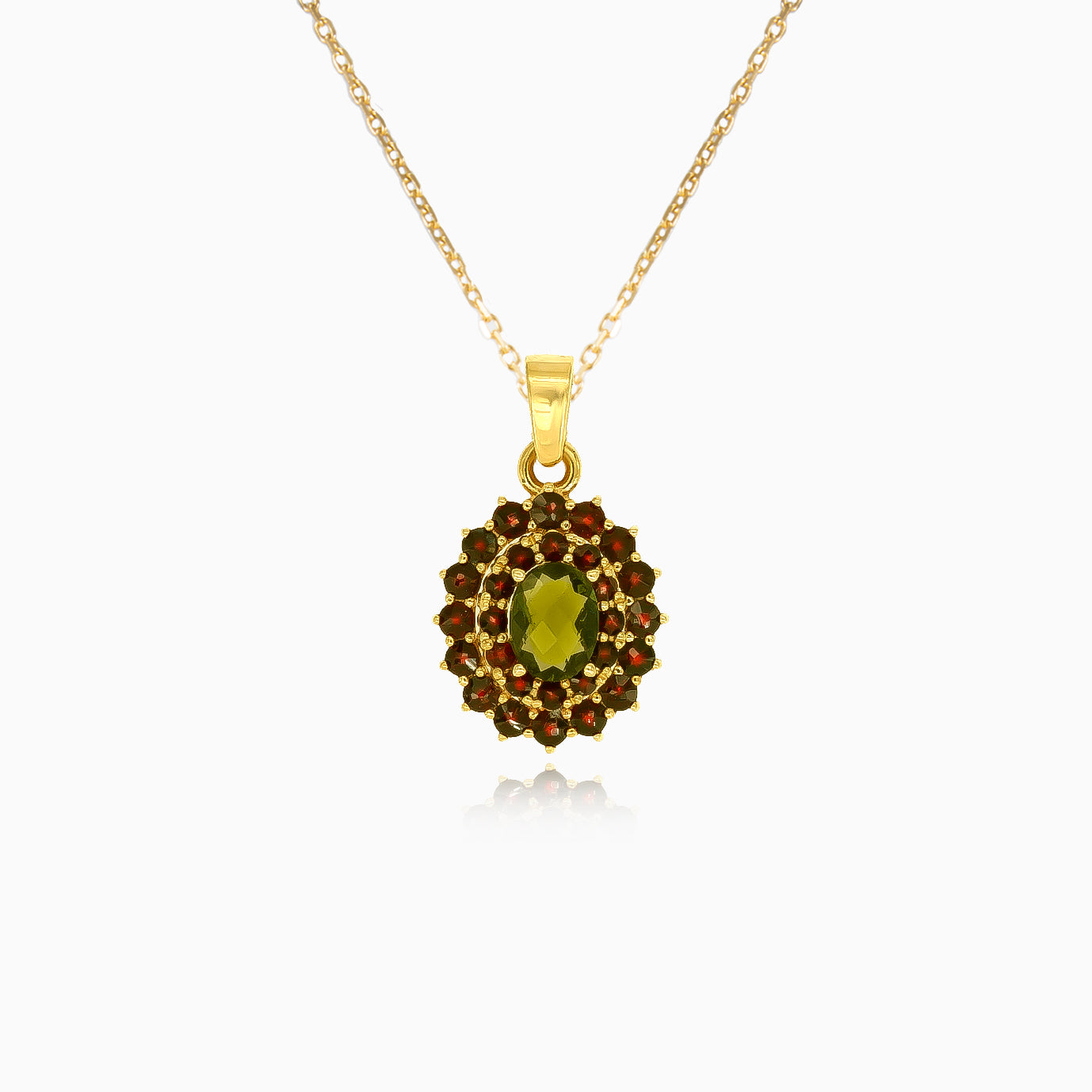 Přívěsek ze žlutého zlata s oválným vltavínem a kulatými granáty