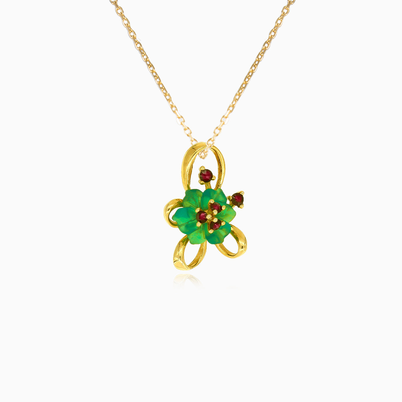 Odhalte nadčasovou krásu s naším přívěskem ze 14kt žlutého zlata, který obsahuje fascinující kombinaci křemene a granátu v kulatém výbrusu, jemně upevněnou v klasickém čtyřzubém zasazení. Tento šperk je symbolem harmonické elegance a vytříbeného řemeslného zpracování.