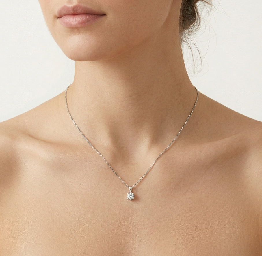 Klasický kulatý kubický zirkon zasazený do stříbra a zajištěný čtyřmi krapnami.