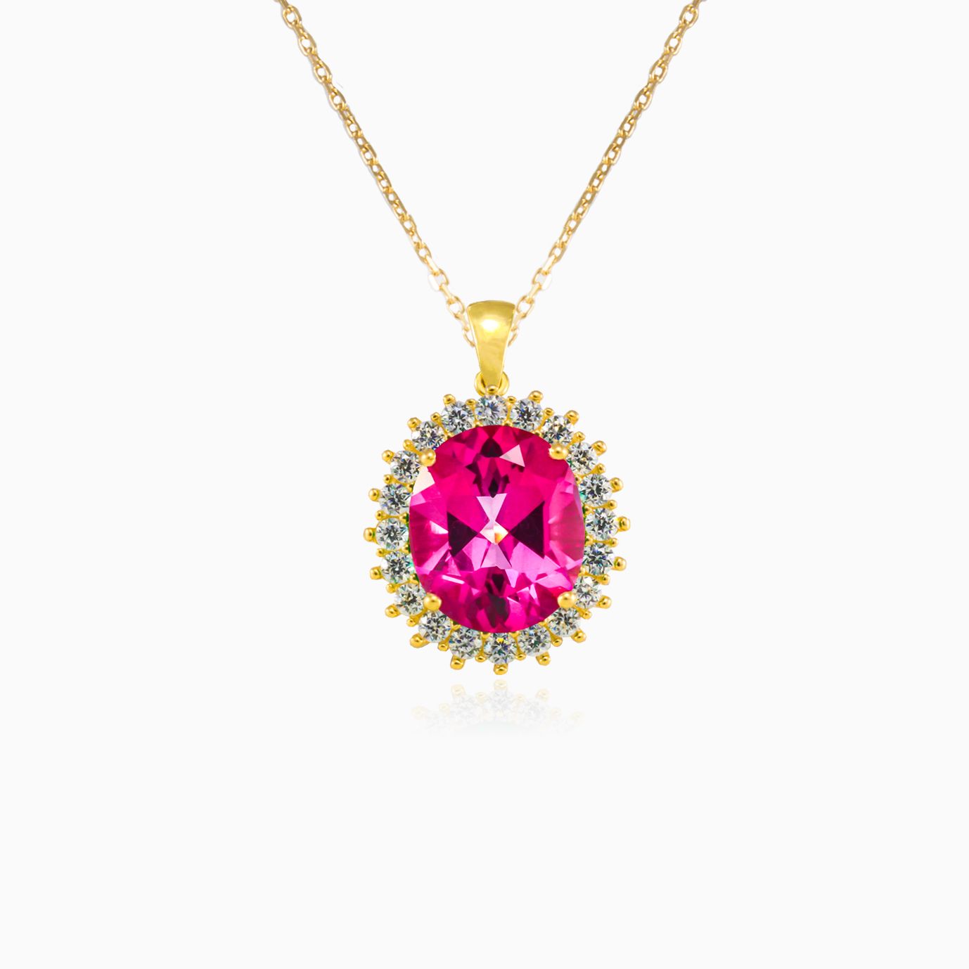 Tento okouzlující královský přívěšek je vyroben z 14K žlutého zlata a je kombinován s dokonalým oválným růženínem, který je doplněn svatozáří, kterou tvoří kruhové osazení kubických zirkonů do krapen. Přívěšek má vetší závěsné ouško, pro lehčí uchycení na řetízek.