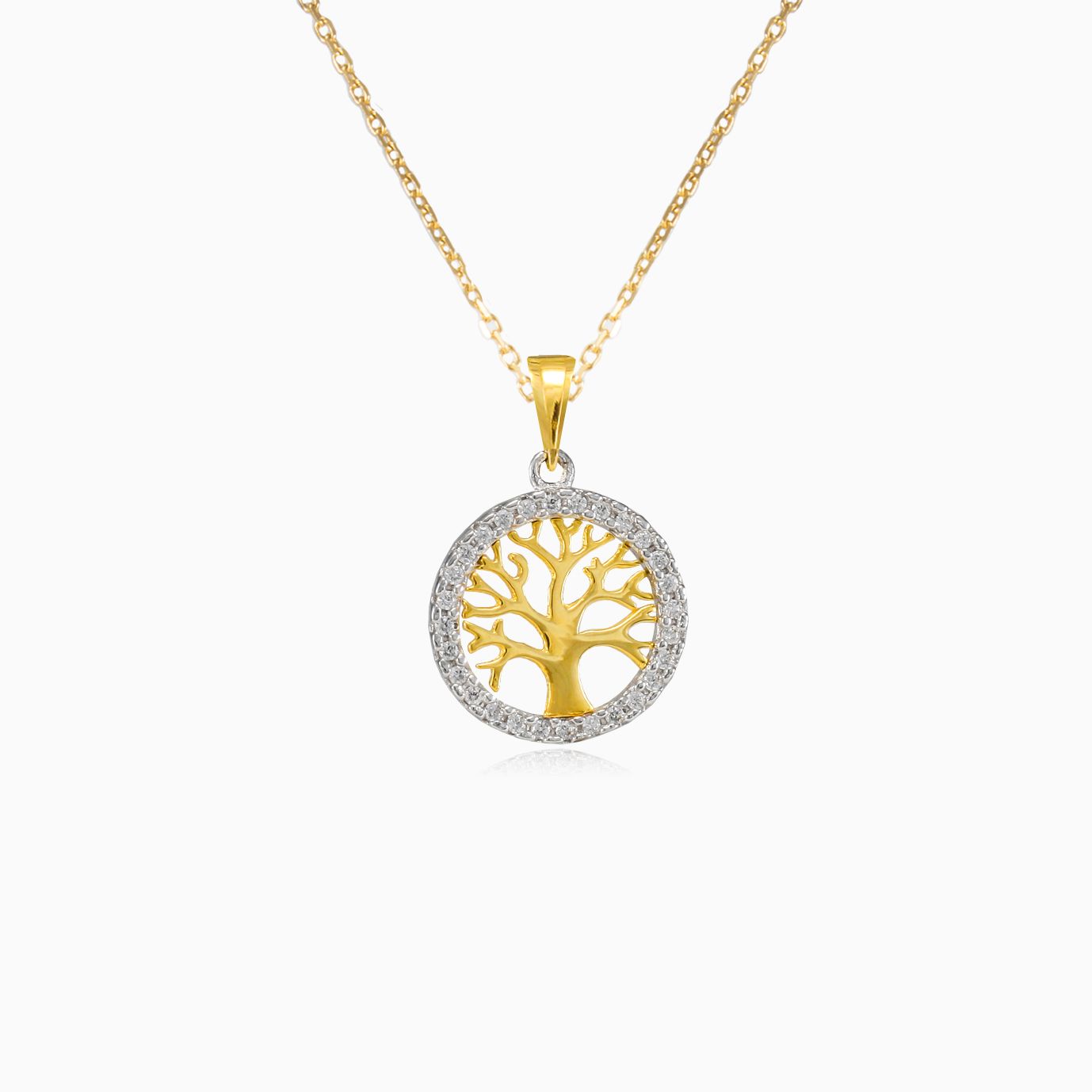 Tento unikátní přívěšek je vyroben z 14K žlutého a bílého zlata. Přívěšek slouží k zavěšení na řetízek. Šperk je osazen kruhovou lunetou kolem stromu života, pomocí rámečku z bílého zlata.