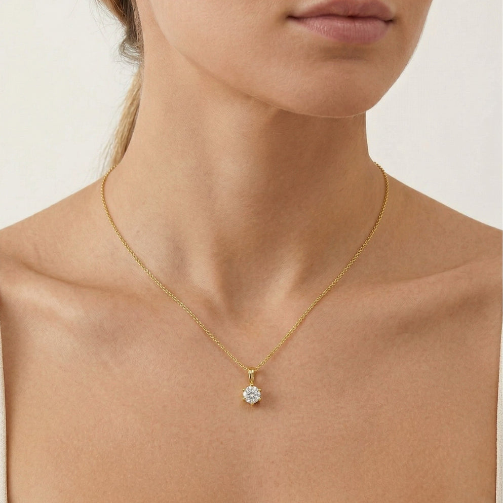 Klasický šesticípý přívěšek je vyroben z 14K žlutého zlata a je kombinovaný s kulatou kubickou zirkónií, která má briliantový výbrus.