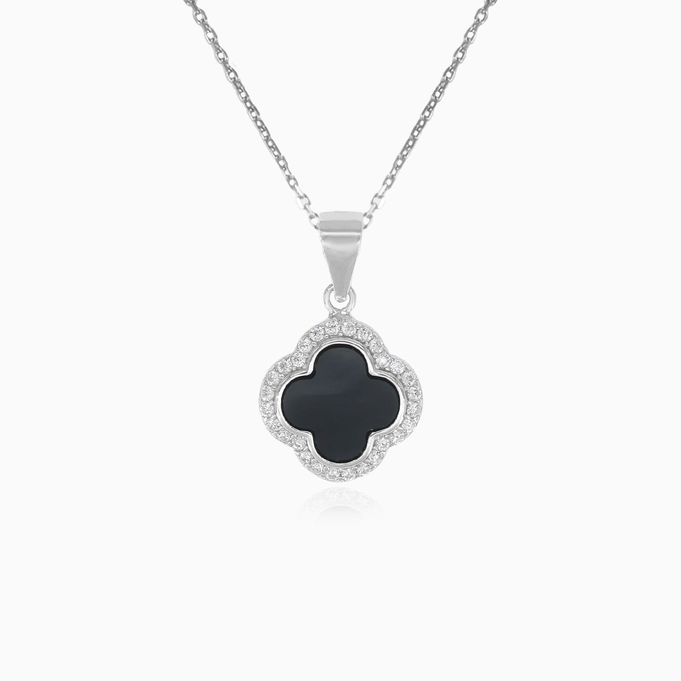 Dámský stříbrný přívěsek s jemným vzorem čtyřlístku zdobeným plochým onyxem a třpytivou aureolou z kulatých jemných zirkonů. Zubové zasazení umocňuje jejich lesk a činí z tohoto přívěsku sofistikovaný a nadčasový šperk pro každou příležitost.