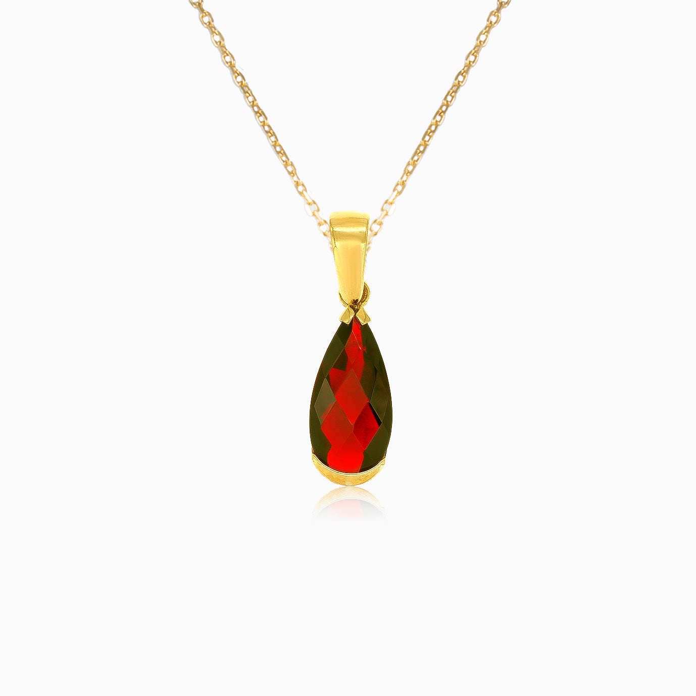 Ozdobte se elegantním přívěskem ze 14kt žlutého zlata. Přívěsek zdobí granát ve tvaru hrušky s jemným stupňovitým výbrusem, který je bezpečně zasazen do tyčinky.