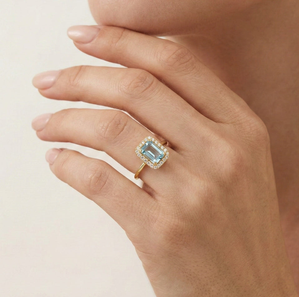 Zlatý prsten s modrým topazem, emerald brus