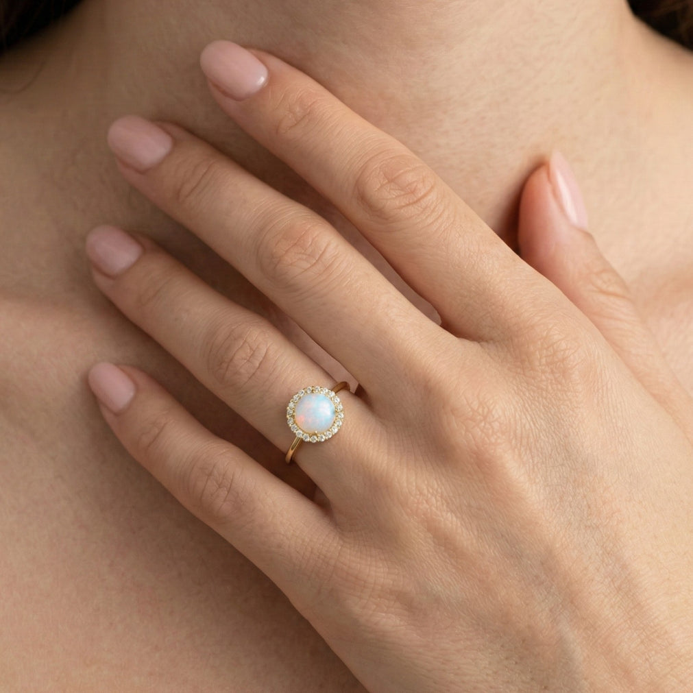 Klasický design prstenu z 14-karátového žlutého zlata s kulatým bílým opálem obklopeným aureolou z kubické zirkonie.