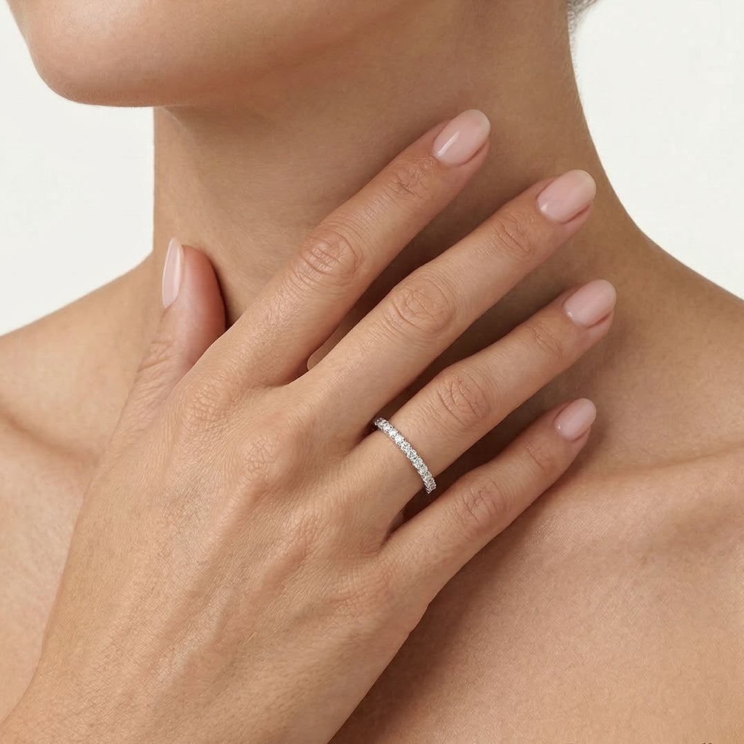 Zvýrazněte svoji eleganci tímto jednoduchým 14kt prstenem z bílého zlata zdobeným řadou kulatých diamantů o celkové hmotnosti 0,17ct, s čistotou SI1 a barvou H.