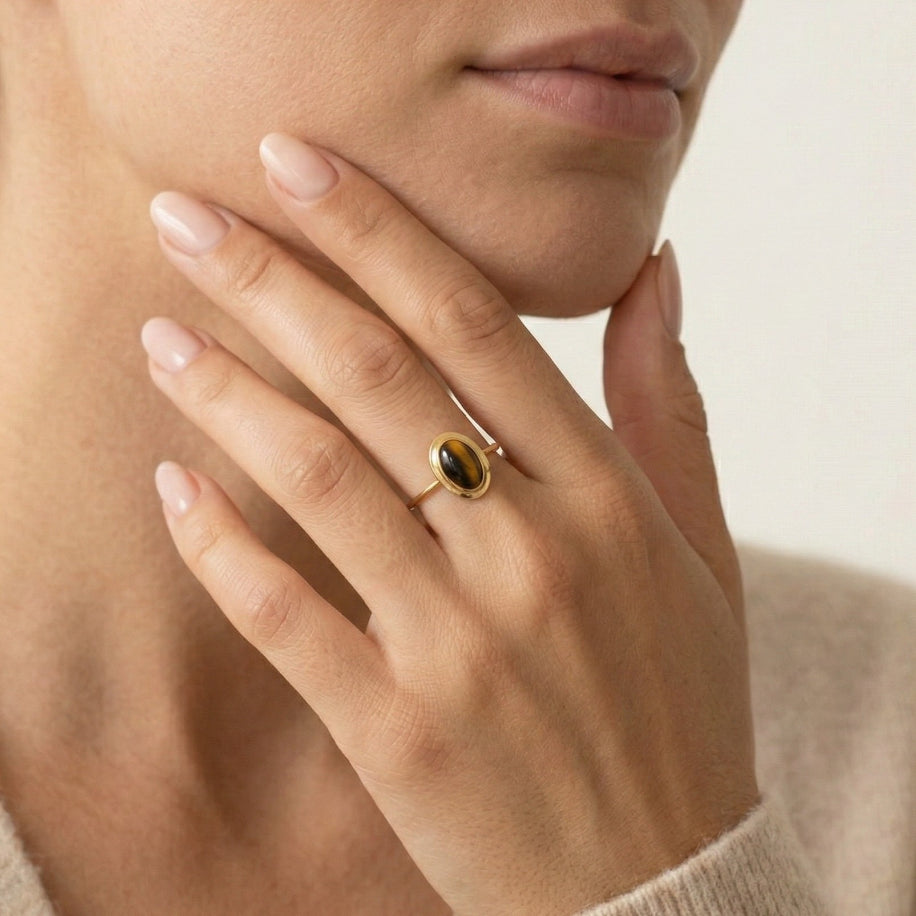 Klasický prsten je vyroben z 14 karátového žlutého zlata kombinovaný s lunetou s oválným broušeným tygřím okem.