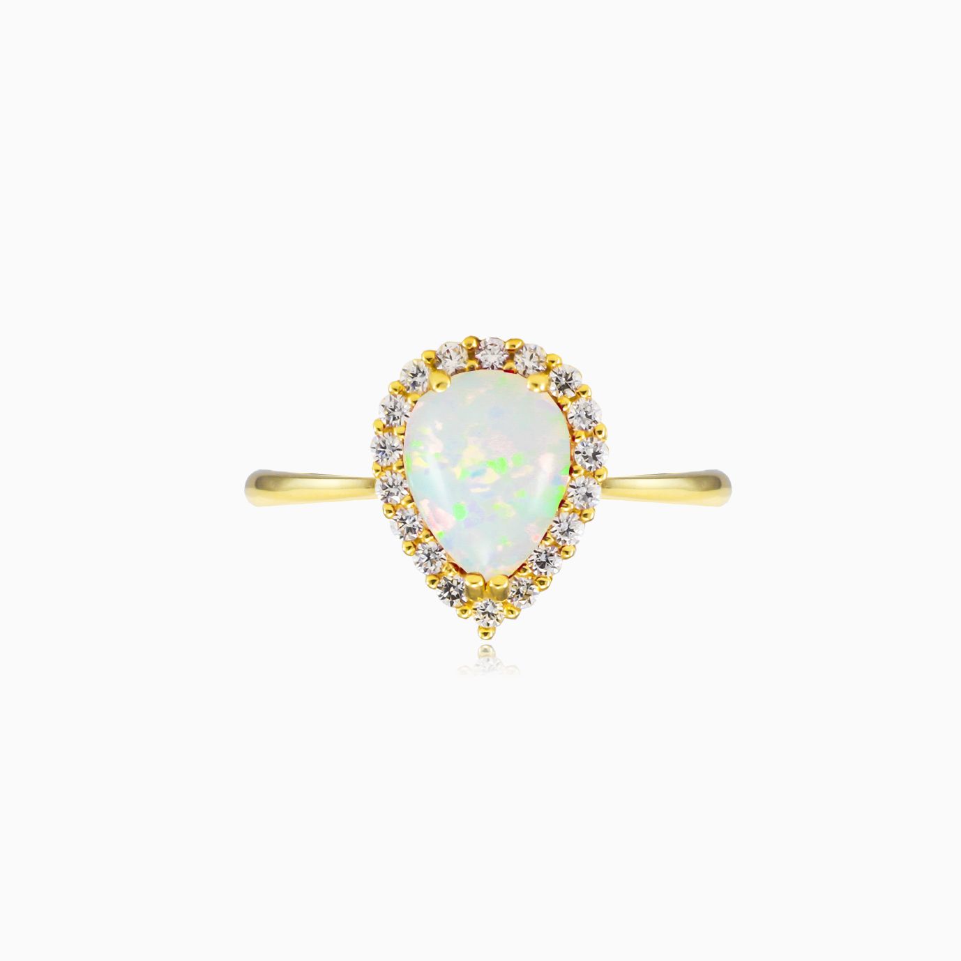 Prsten z 14-karátového žlutého zlata s bílým opálem kapkového brusu a aureolou z kubické zirkonie.