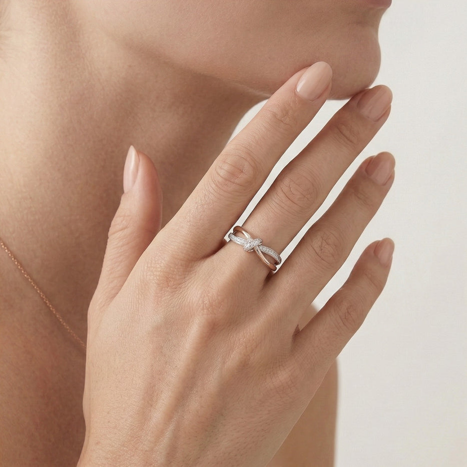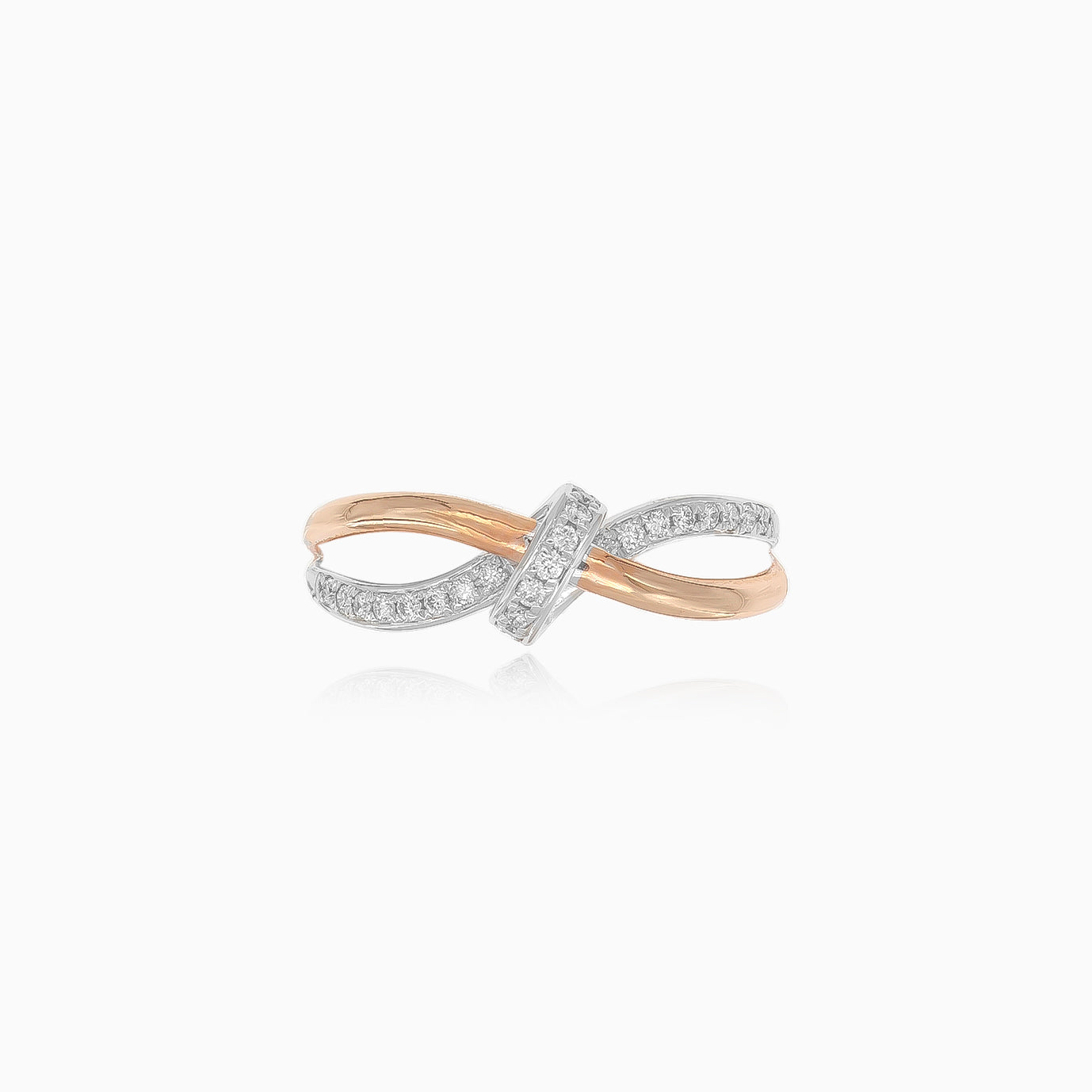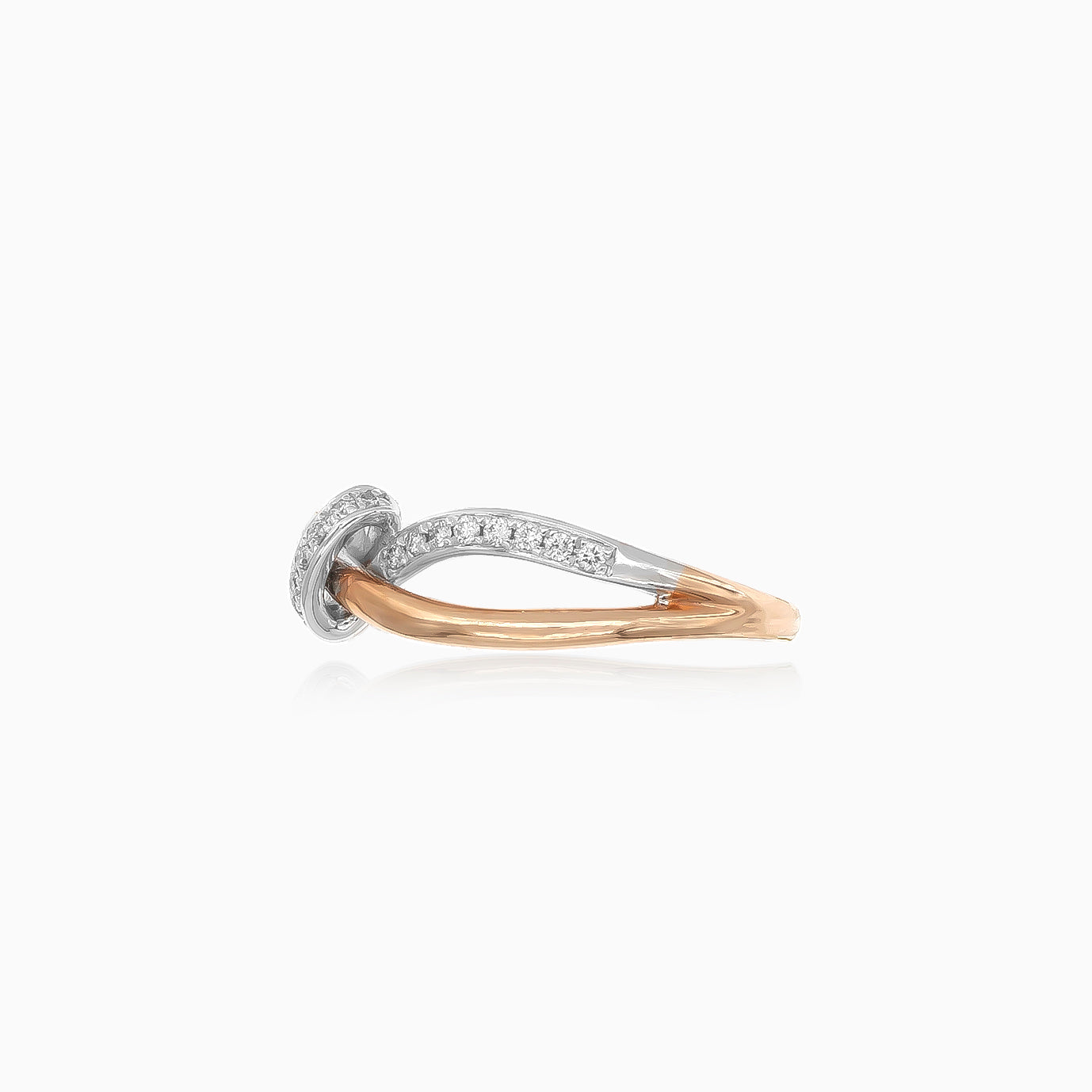 14kt prsten z bílého a růžového zlata, zdobený diamanty o váze 0,14ct s čistotou VS1 a barvou stupně G.