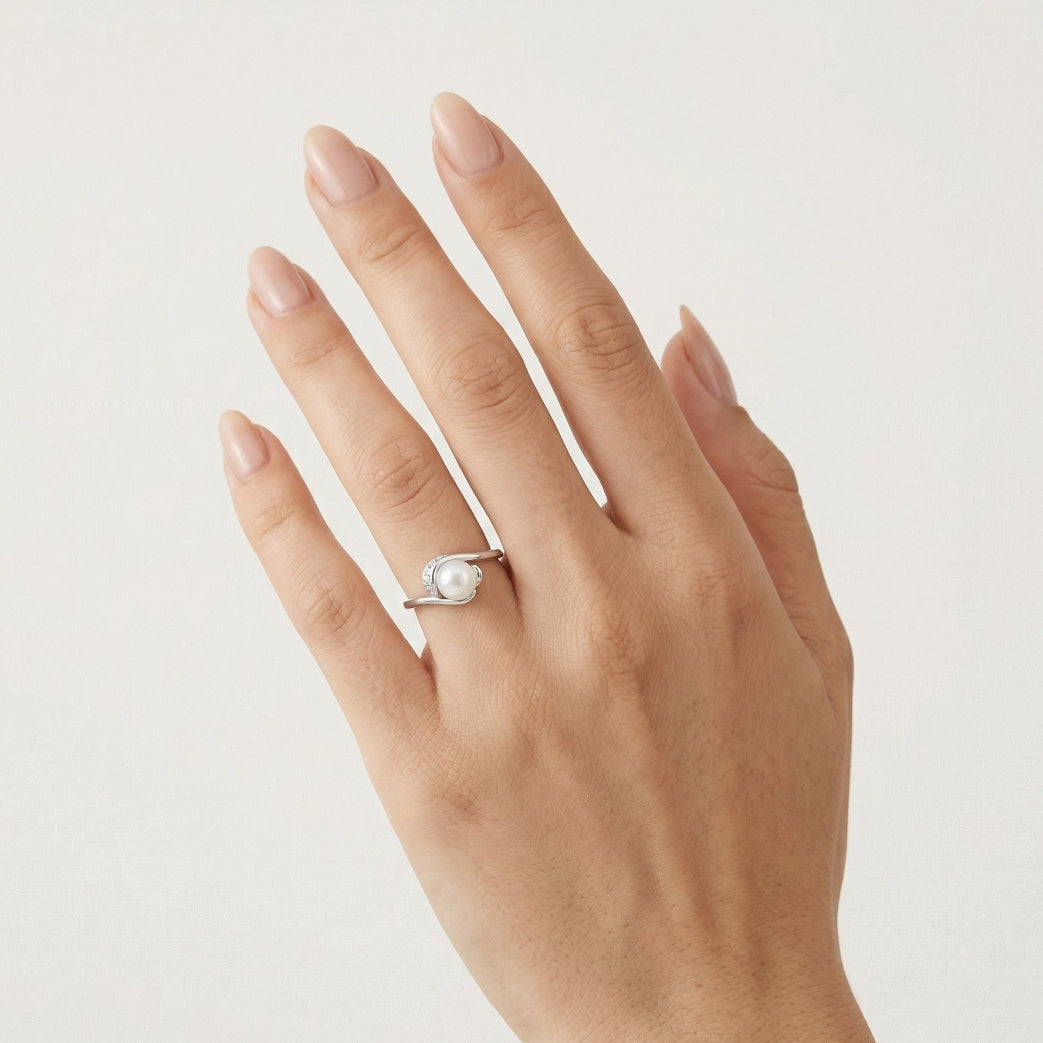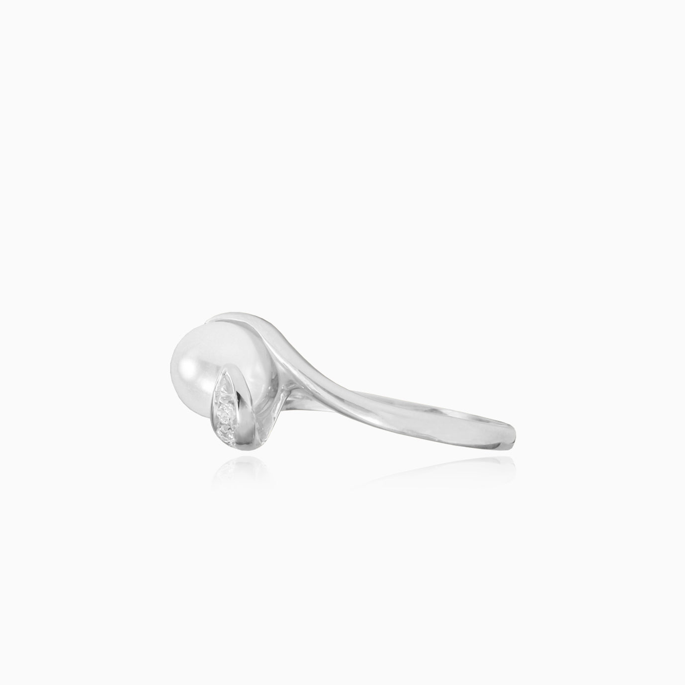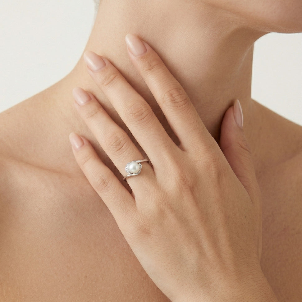 Tento dámský prsten ze 14kt bílého zlata má ve svém středu zářivou kulatou sladkovodní bílou perlu, kterou zvýrazňují kulaté drobné stupňovitě broušené zirkony. Díky bezpečnému zasazení a jedinečnému designu nabízí kombinaci klasické elegance a moderního šarmu.