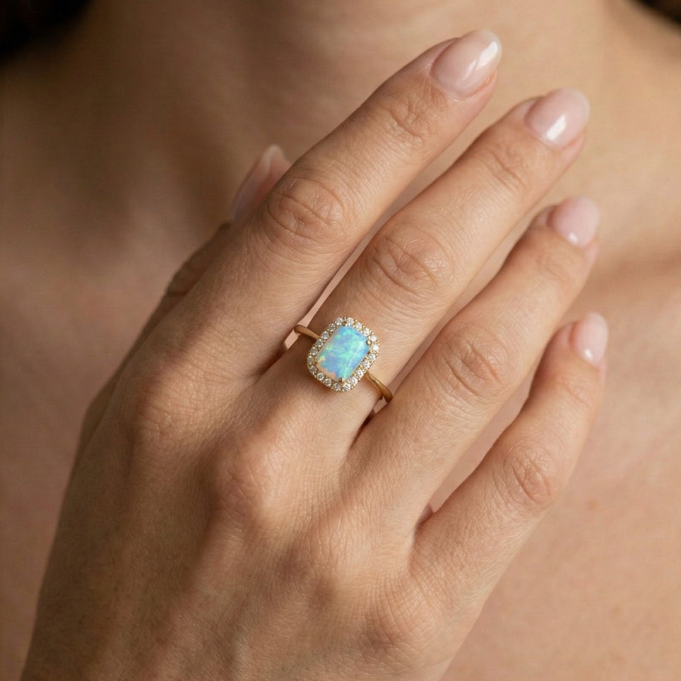Krásný klasický prsten ze 14kt zlata s lunetou z kulatých kubických zirkonů, které obklopují obdélníkový kabošon Opal.
