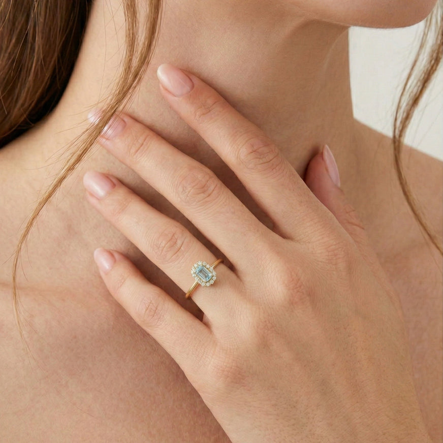 Prsten je vyroben z 14 karátového zlata a je kombinován s topazem smaragdového výbrusu. Celý tvar hlavy prstenu je dotvořen kubickými zirkony briliantového výbrusu, které jsou osazeny podél obvodu středového kamene v lunetách.
