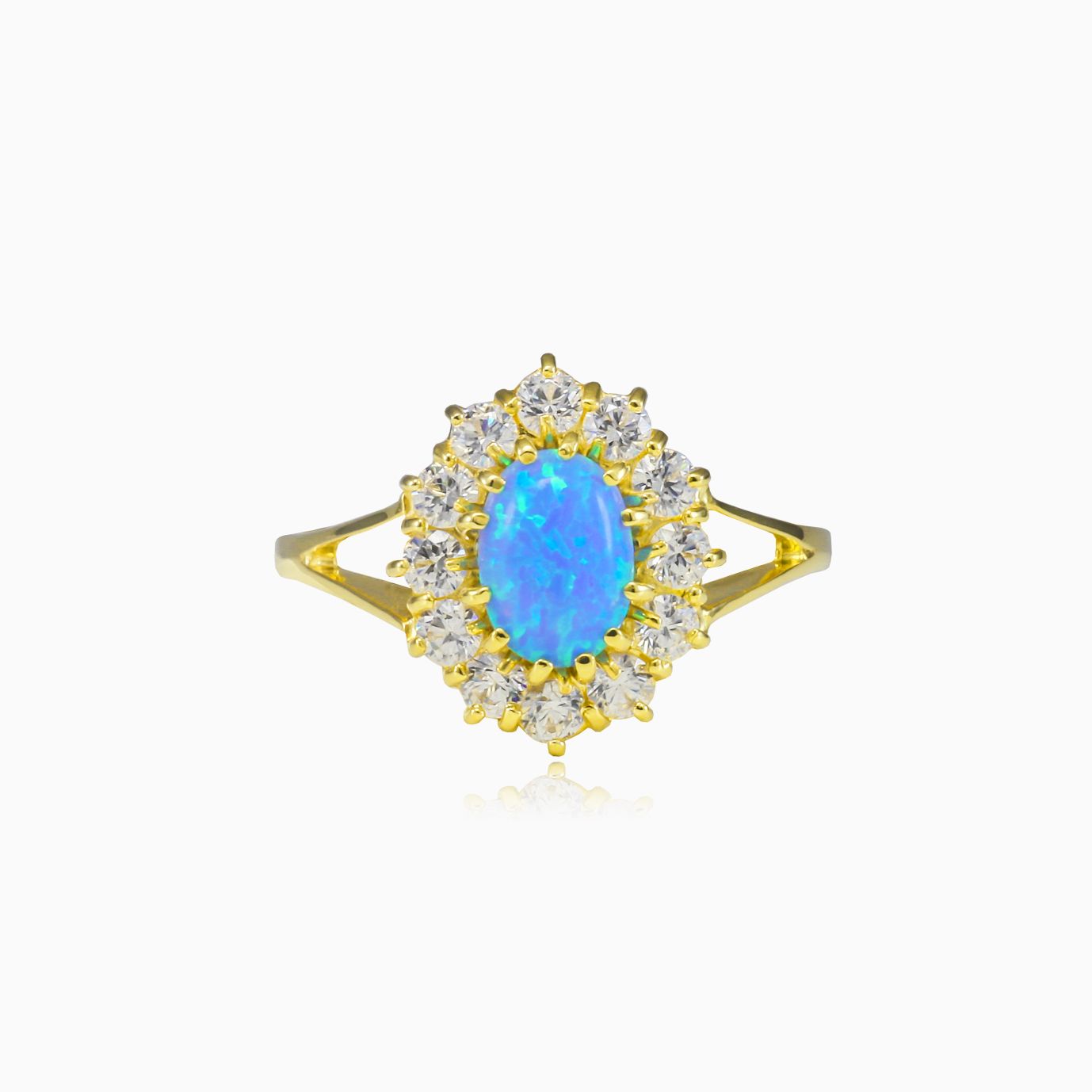 Královský prsten ze žlutého 14K zlata v kombinaci s oválným broušeným modrým opálem a lunetou z kubické zirkonie.