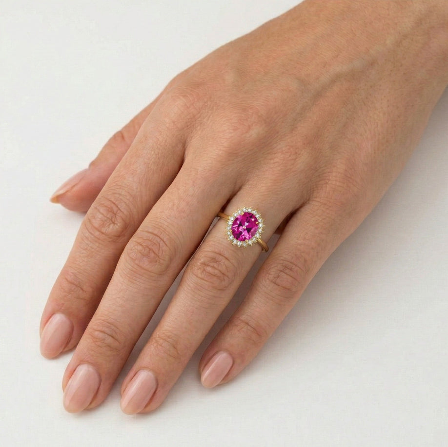 Okouzlující prsten je zhotoven ze žlutého 14 karátového žlutého zlata v kombinaci s dokonalým syntetickým růžovým kamenem a lunetou z kubické zirkonie.