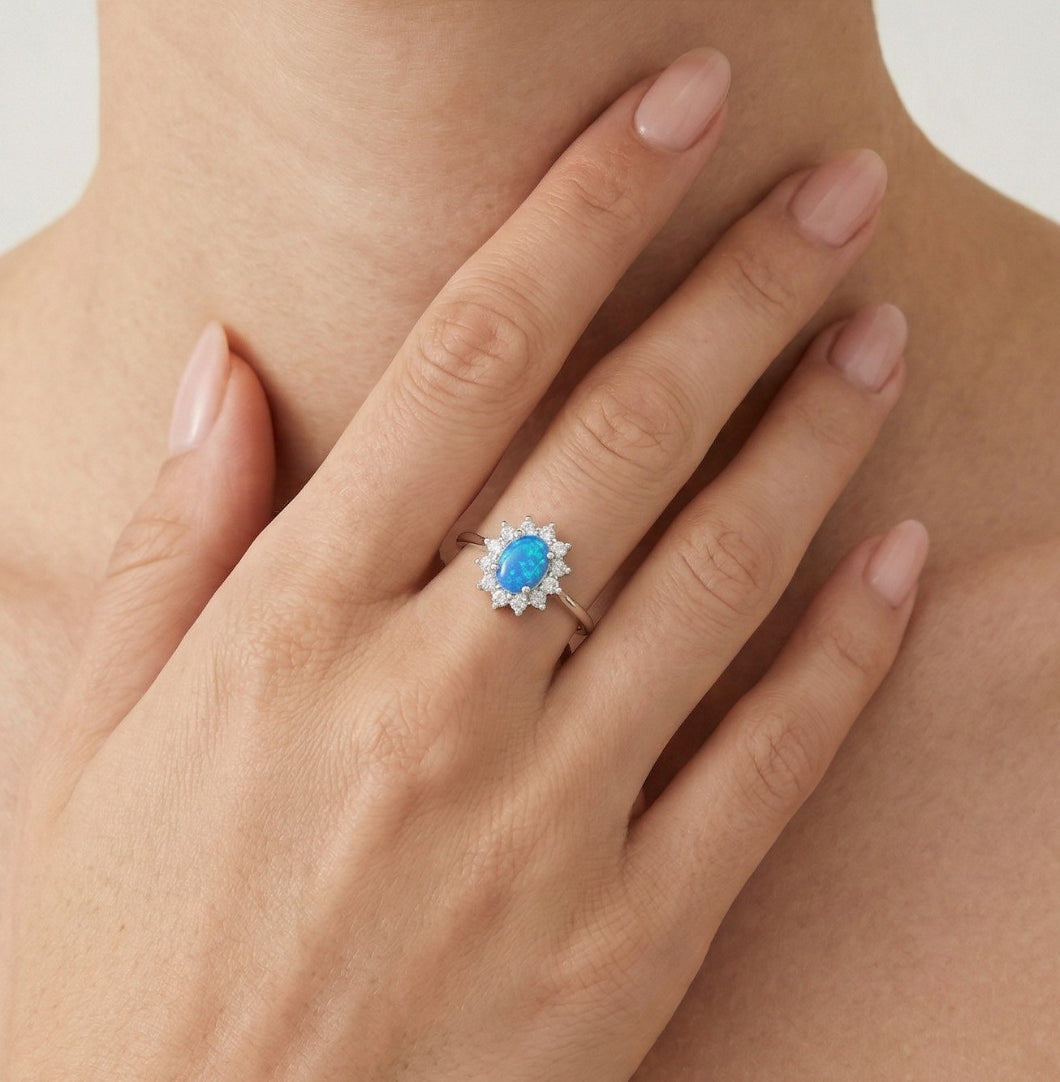 Prsten v klasickém královském designu ze stříbra v kombinaci s oválným broušeným modrým opálem a svatozáří z kulatých drobných stupňovitě broušených kubických zirkonů a zajištěný zasazením do zářezu.
