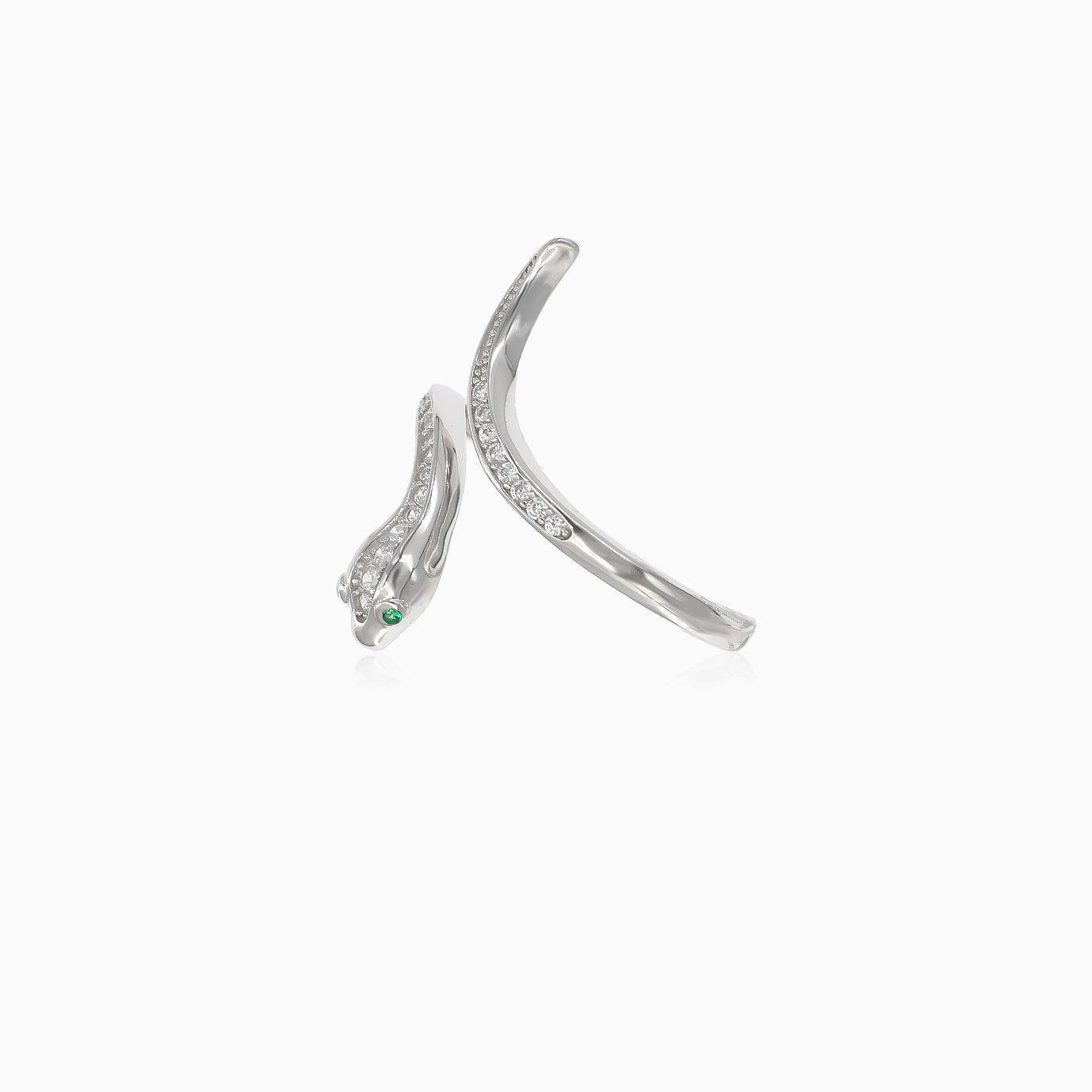 Vyzdvihněte svůj styl s tímto podmanivým dámským stříbrným prstenem s kubickými zirkony a syntetickými smaragdy v jemném stupňovitém výbrusu a se zářezem. Hadí design se zelenýma očima dodá každému vzhledu nádech mystiky.