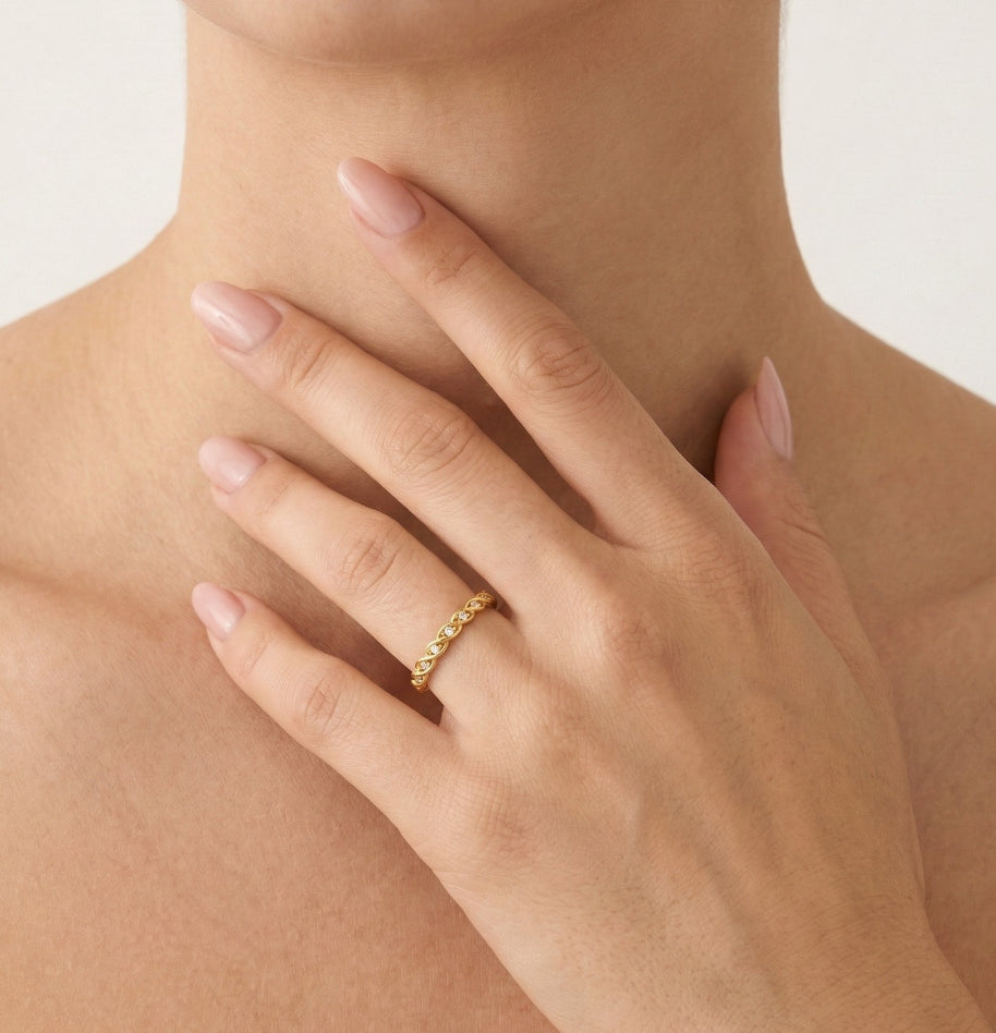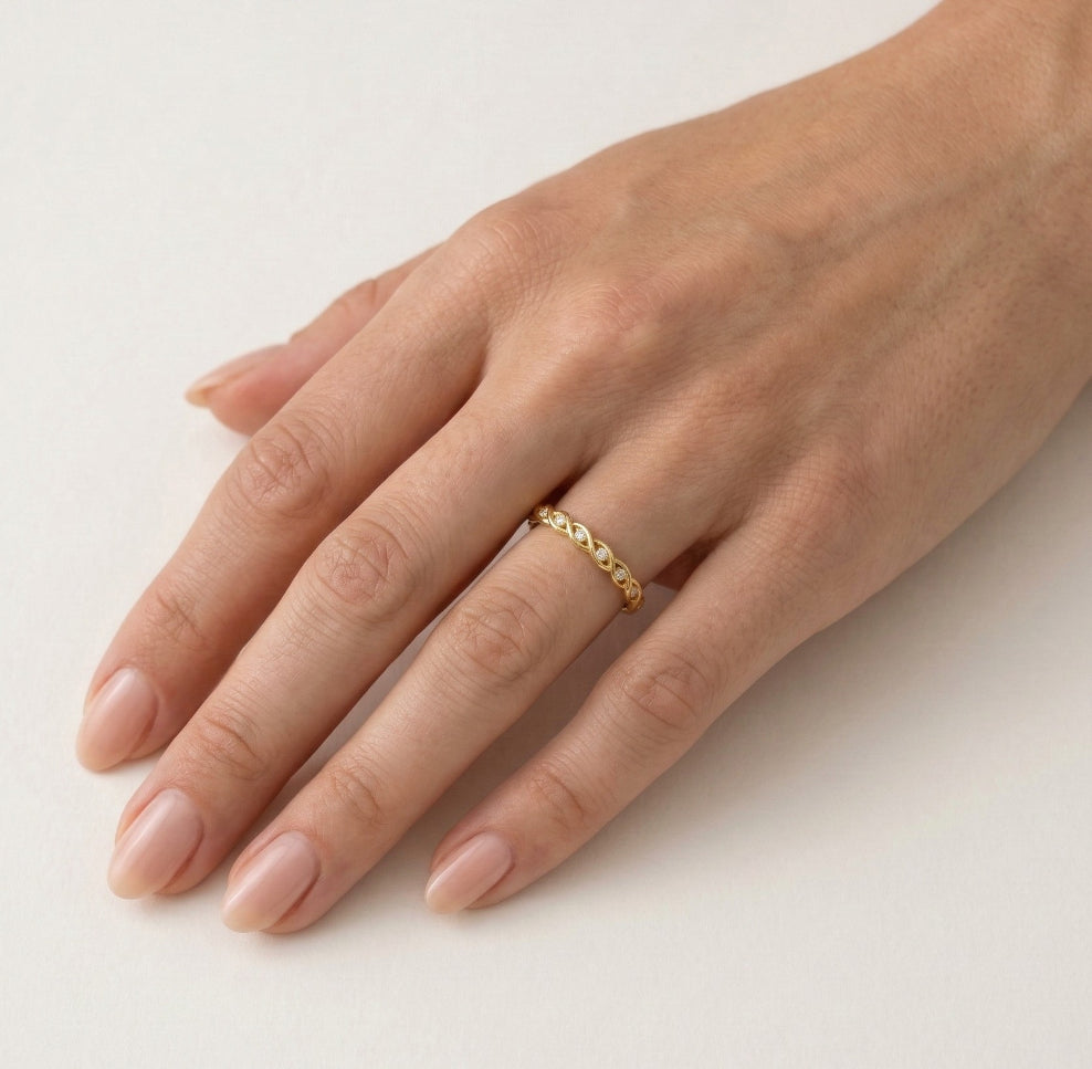 Zvýšte svůj styl s tímto tenkým a módním prstenem s jedinečným propleteným designem. Vyrobený z vysoce kvalitního 14kt žlutého zlata, tento prsten je zdobený zářivými kulatými zirkony, které dodají každému outfitu dotek elegance.