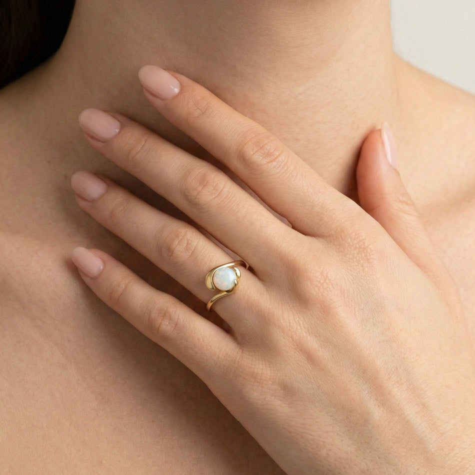 Jedinečný prsten je vytvořen z 14K žlutého zlata a je doplněn kulatým bílým opálem, který se nachází v centru šperku.
