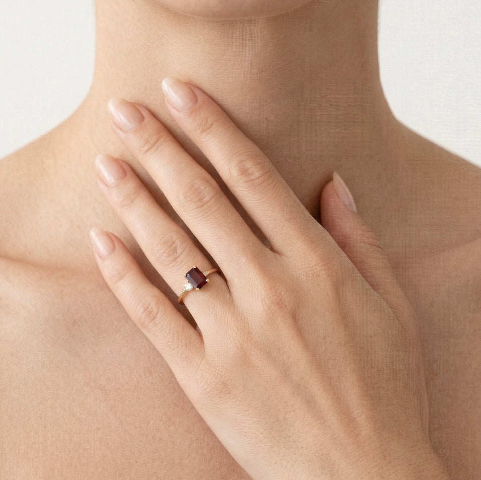 Zlatý dámský prsten s kubickými zirkony a granátem