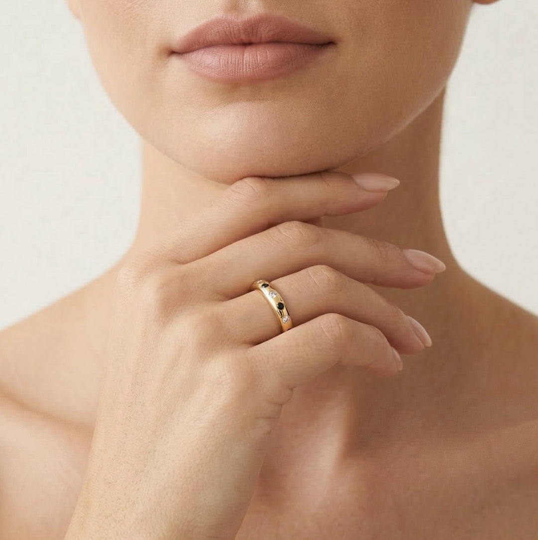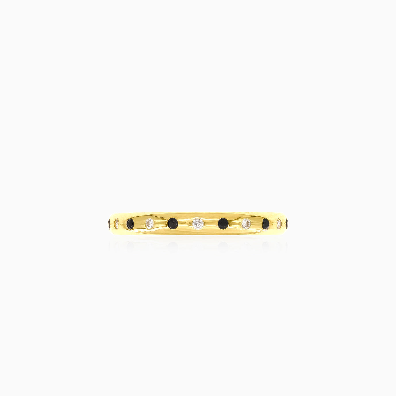 Prsten ze 14kt žlutého zlata s kulatými zirkony a černými onyxy, určený pro muže i ženy, v elegantní obroučce.