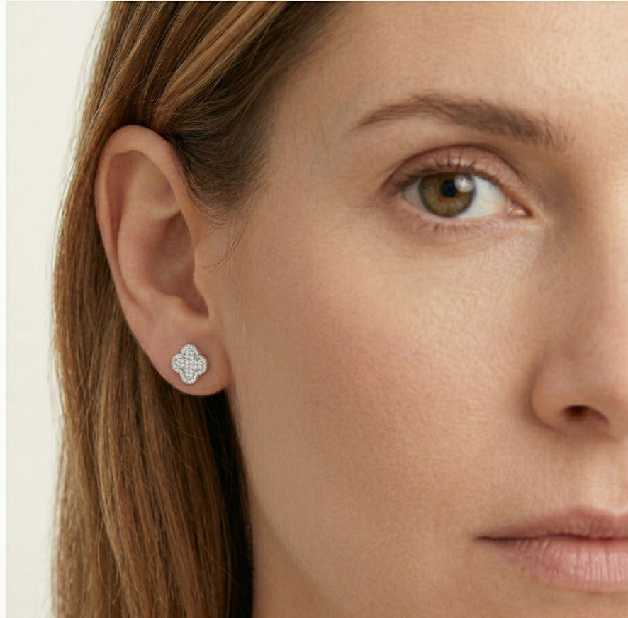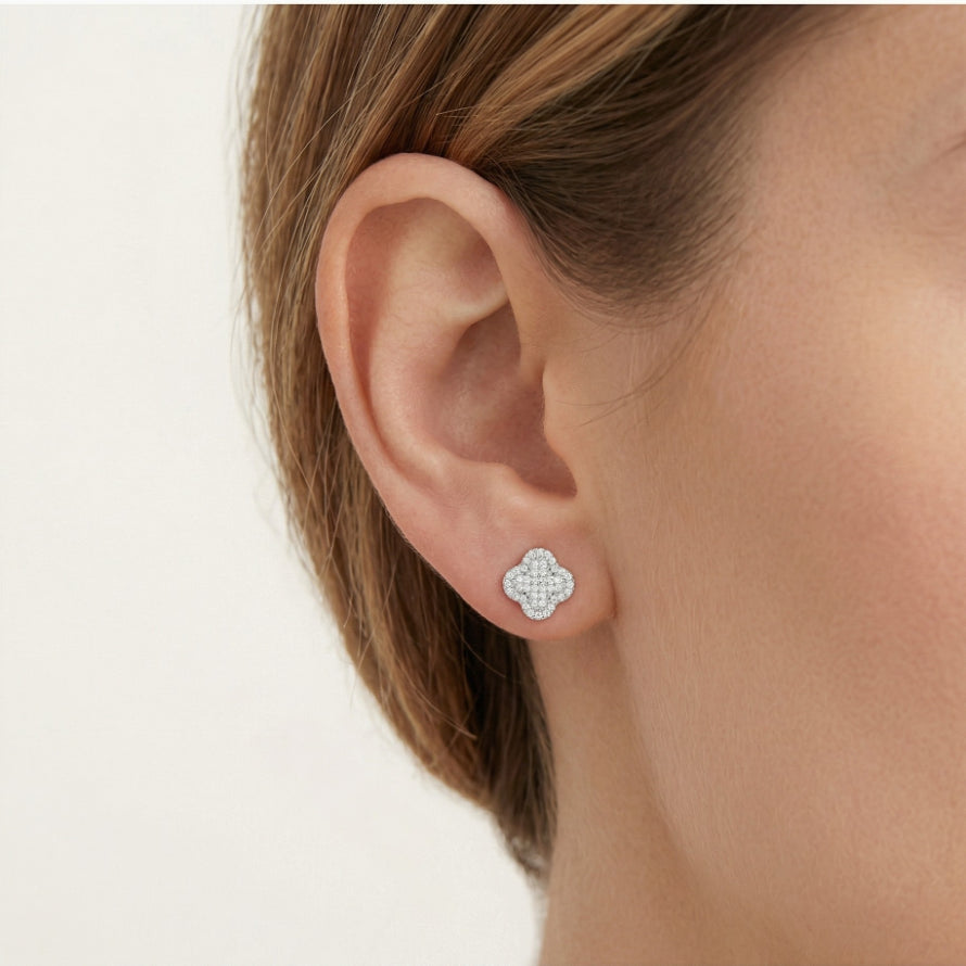 Tyto elegantní stříbrné náušnice mají design čtyřlístku osazený třpytivými kameny kubické zirkonie s kulatým jemným stupňovitým výbrusem. Osazení hroty zvýrazňuje lesk kamene, zatímco puzetové zapínání nabízí bezpečné celodenní pohodlí. Ideální pro dodání nádechu štěstí a stylu každému vzhledu.