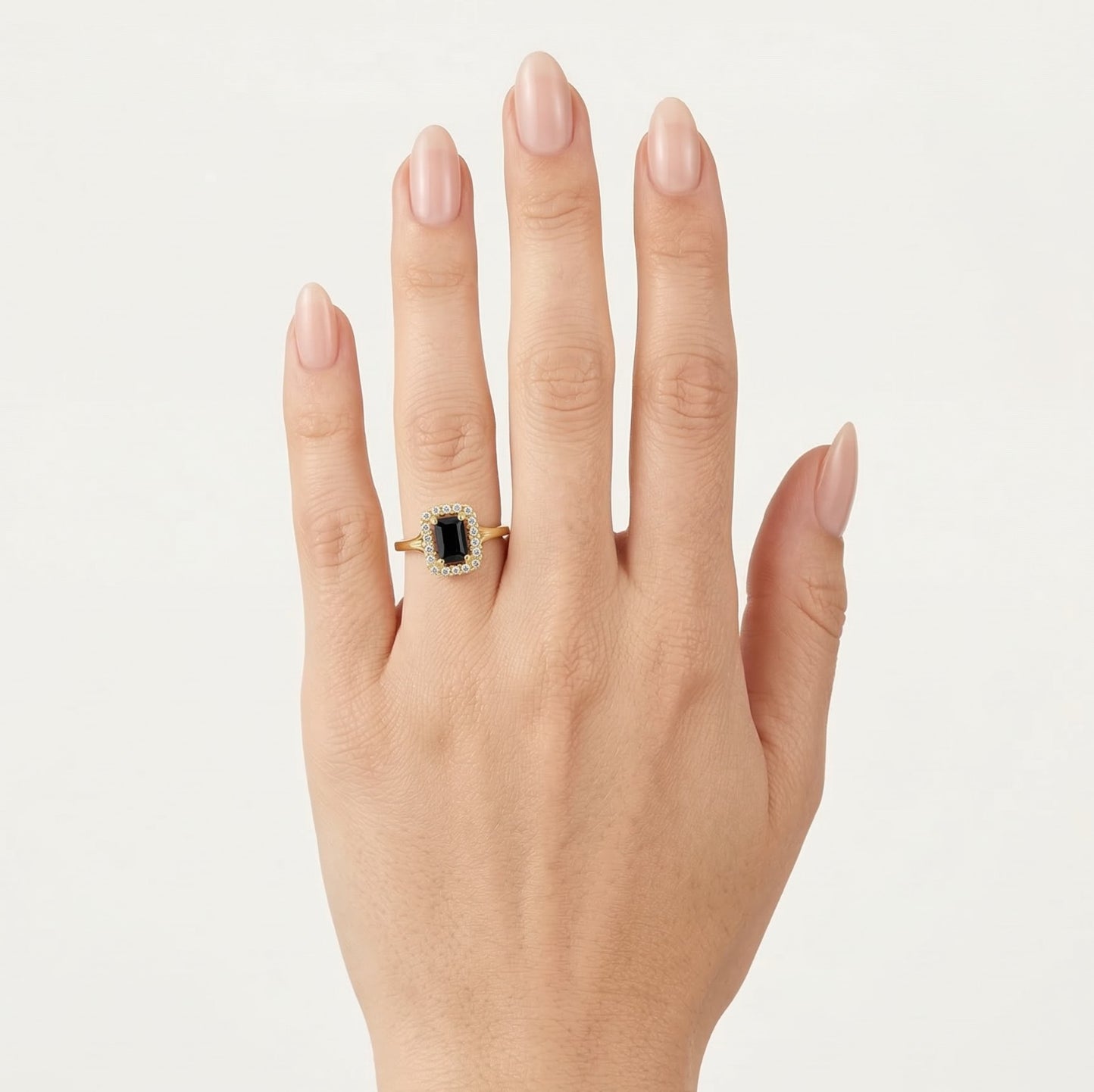 Tento dámský prsten ze 14karátového žlutého zlata, zdobený královským onyxem ve smaragdovém brusu se zirkony pro dotek nadčasové sofistikovanosti, vyzařuje královský půvab.
