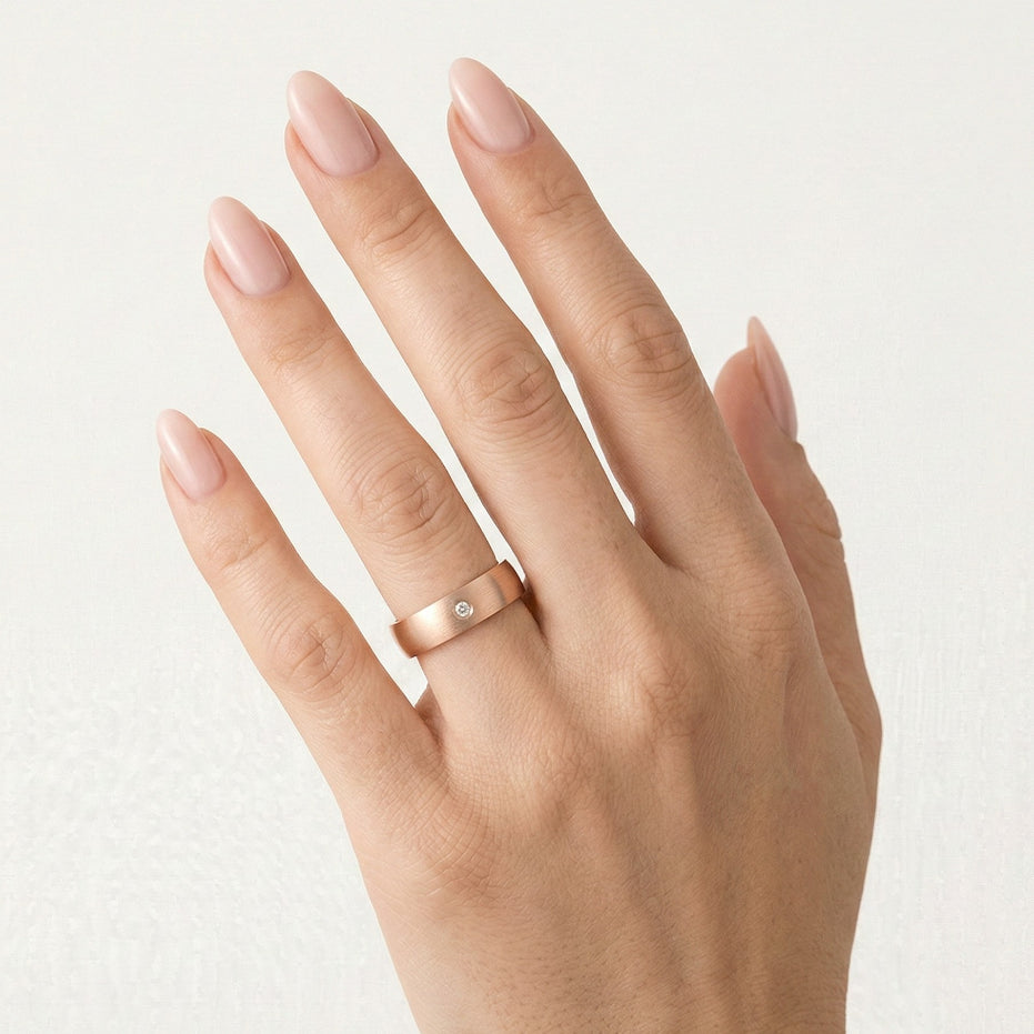 Objevte tento snubní prsten z růžového 14kt zlata o tloušťce 5 mm určený pro muže i ženy. Je vybaven volitelným kubickým zirkonem nebo 0,03ct diamantem s kulatým jemným stupňovitým výbrusem, zasazeným v solitérním nebo hladkém rámečku a dokončeným s matnou strukturou.