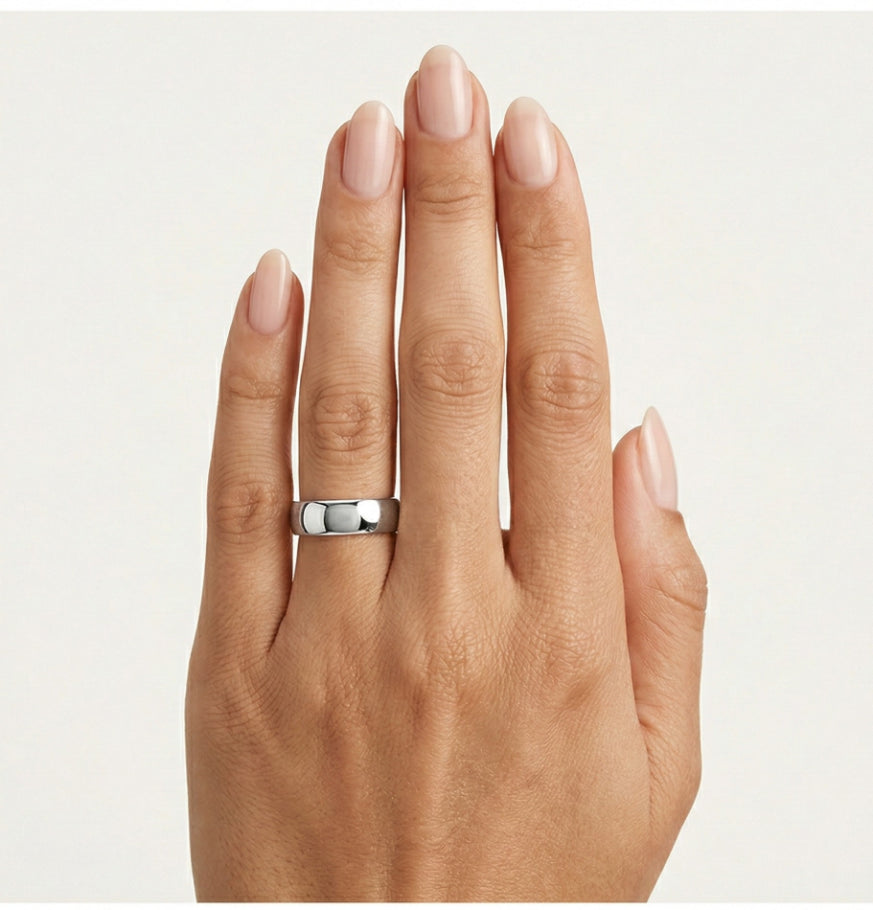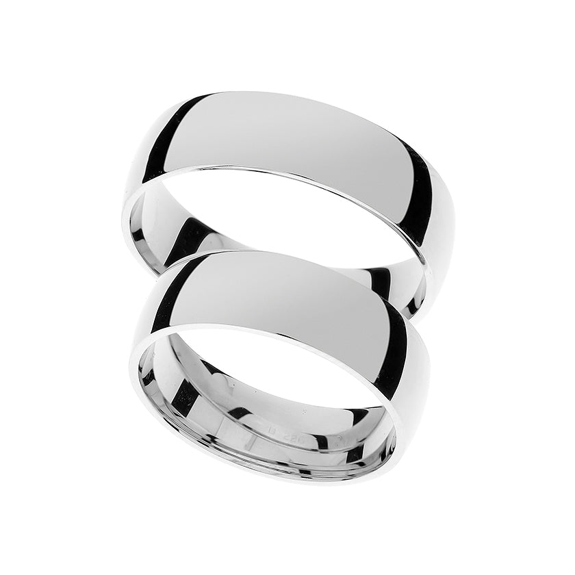 Nadčasové a elegantní snubní prsteny pro muže a ženy ze 14kt bílého zlata. Tyto prsteny mají vysoce leštěný povrch a klasický design se zaoblenými stranami. Díky 6 mm šířce nabízejí rafinovaný vzhled.