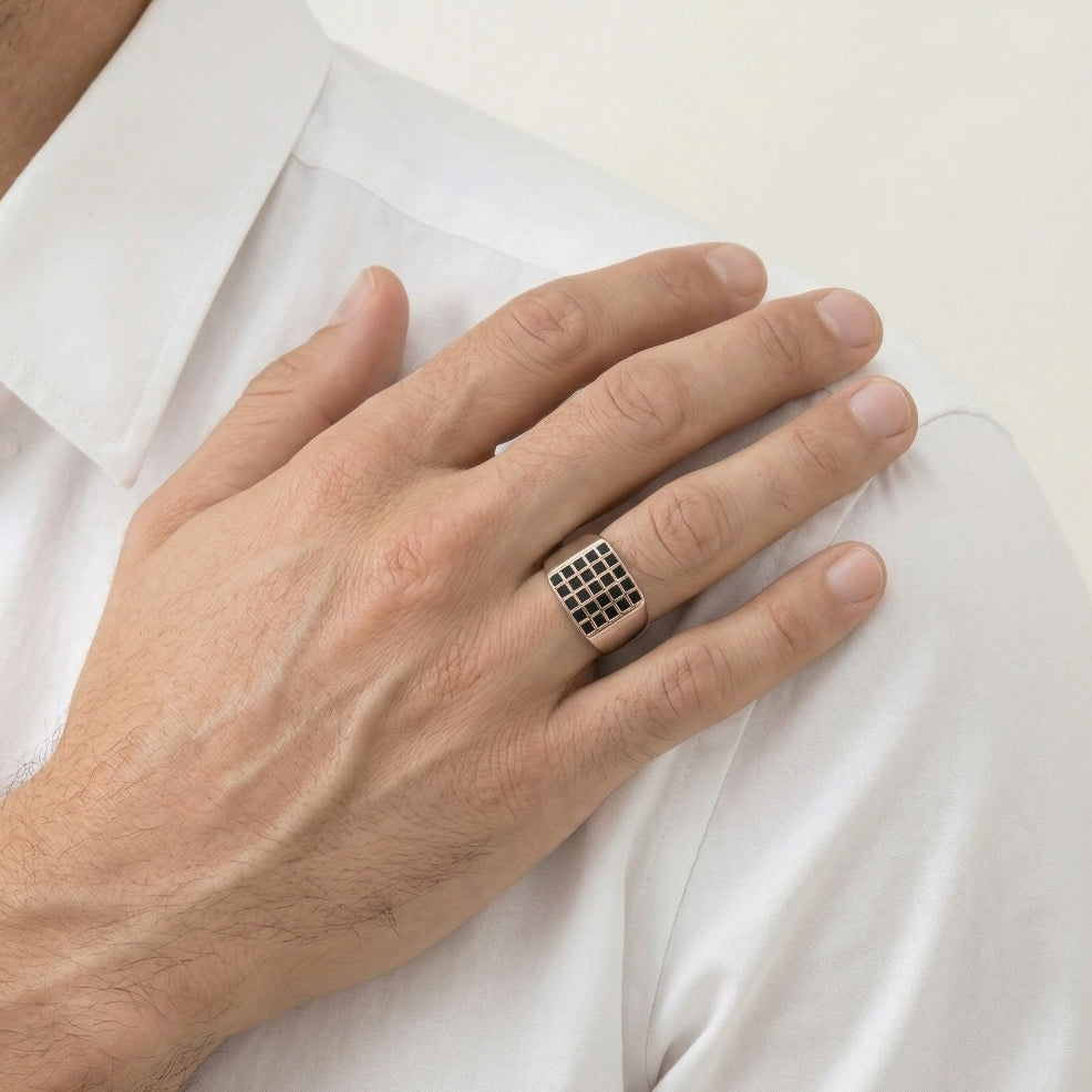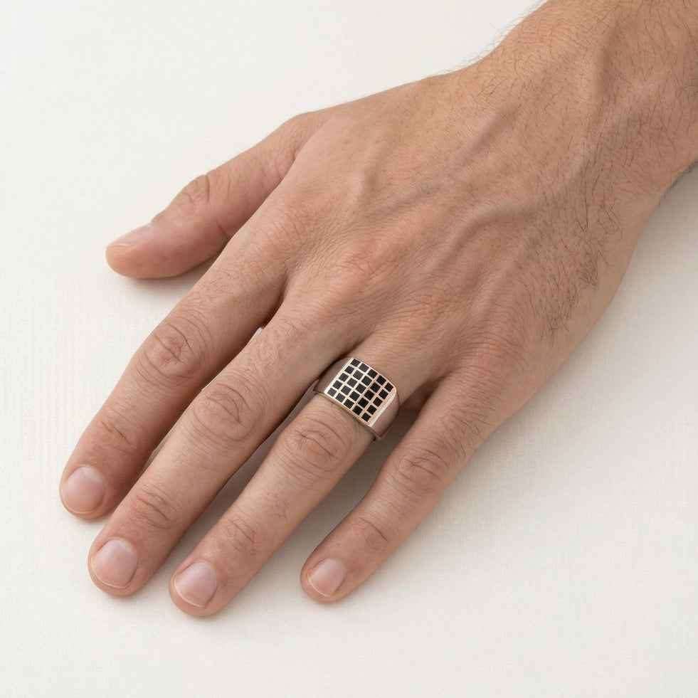 Tento výrazný stříbrný prsten spojuje sílu a jemné řemeslo. Víceřadá emailová úprava dodává hloubku a charakter, díky čemuž je ideální pro muže, kteří hledají elegantní styl s osobitým nádechem. Perfektní pro každodenní sebevědomí i výjimečné okamžiky.