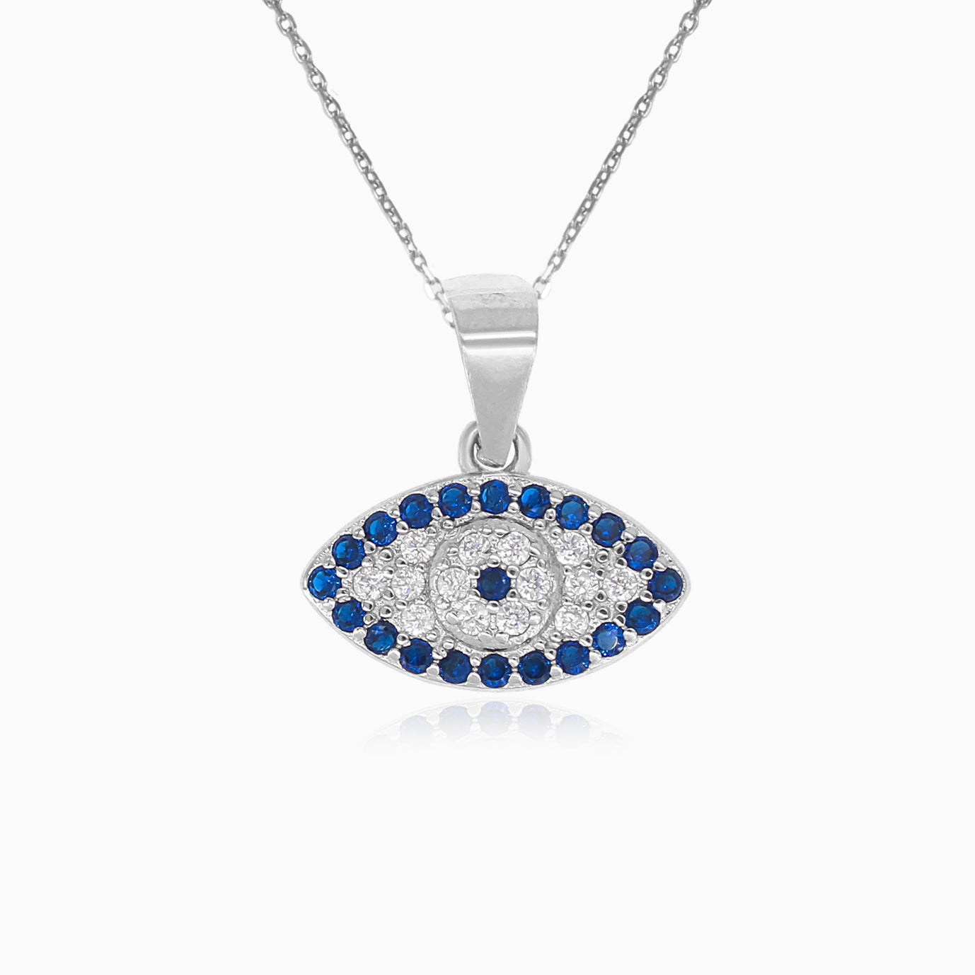 Unisex přívěsek ze sterlingového stříbra s elegantním designem zlých očí v zářivém smaltu. Zdobené kubickou zirkonií a syntetickým safírem v kulatých jemných stupňovitých zářezech, vše zajištěno v nastavení hrotů. Stylový kousek symbolizující ochranu a dodávající každému vzhledu nádech sofistikovanosti.