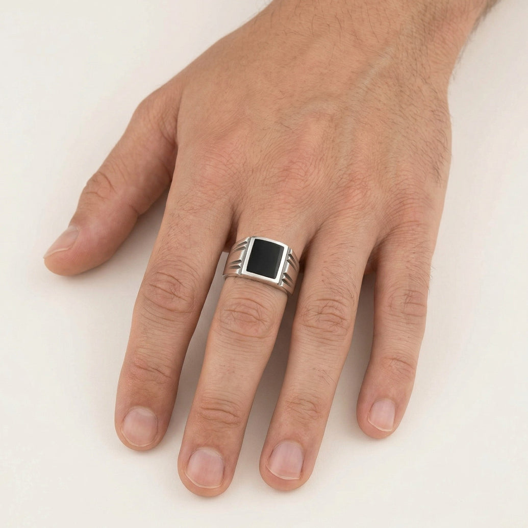 Pánský prsten ze stříbra s černým smaltem, čtvercový