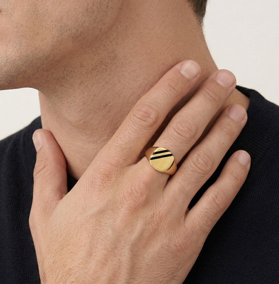 Prsten pro muže z 14-karátového žlutého zlata s plochým černým smaltem a ozdobený detailními linkami po stranách.