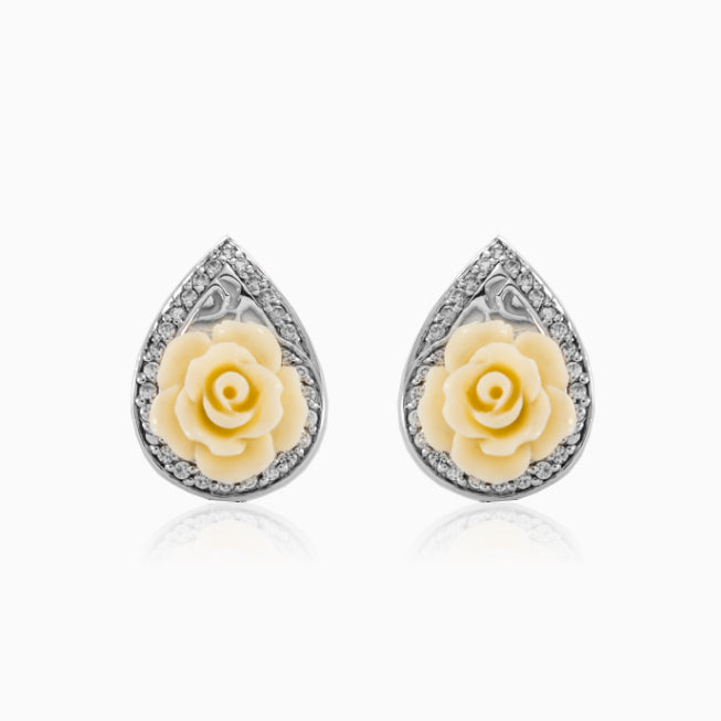 Náušnice ve tvaru kapky zdobené bílým smaltem a kubickou zirkonií s centrální bílou růží. Tento jedinečný pár náušnic je dodáván s anglickým zapínání.