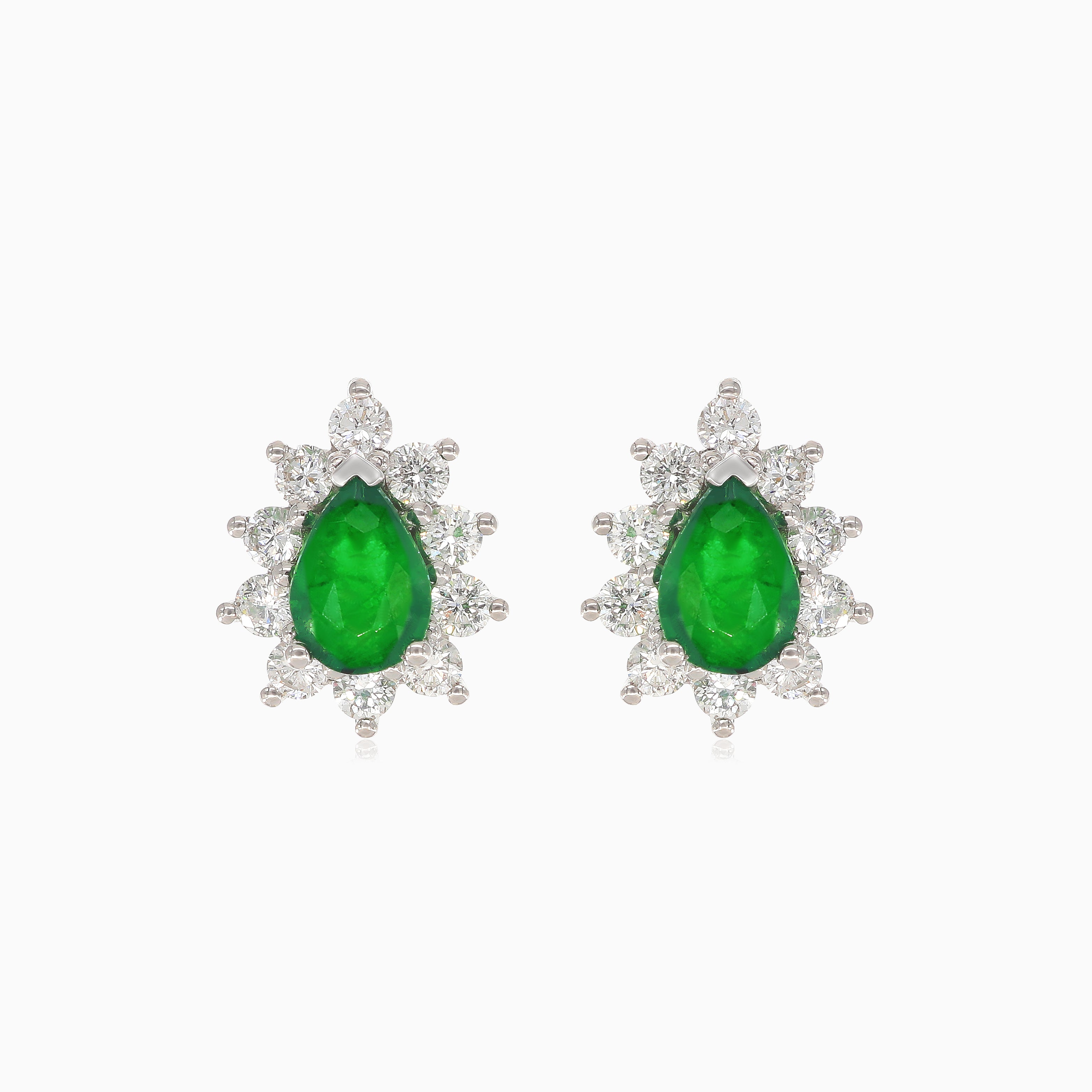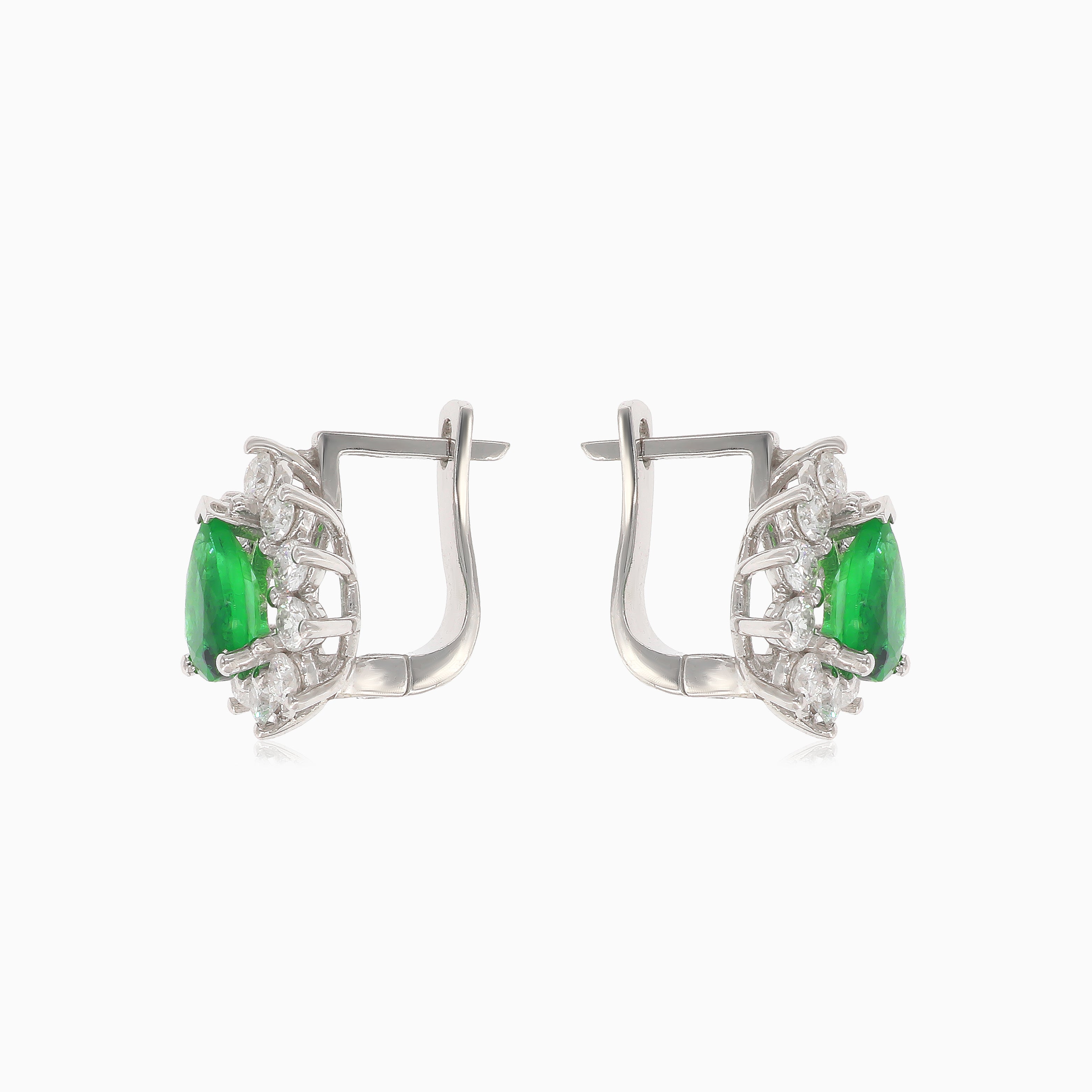 Vylepšete svůj styl těmito úžasnými náušnicemi z bílého 14kt zlata. Tyto náušnice s kulatými jemnými stupňovitě broušenými diamanty a hruškovými jemnými stupňovitě broušenými smaragdy jsou pro větší pohodlí a bezpečnost zajištěny pohodlným zapínáním na patentku.