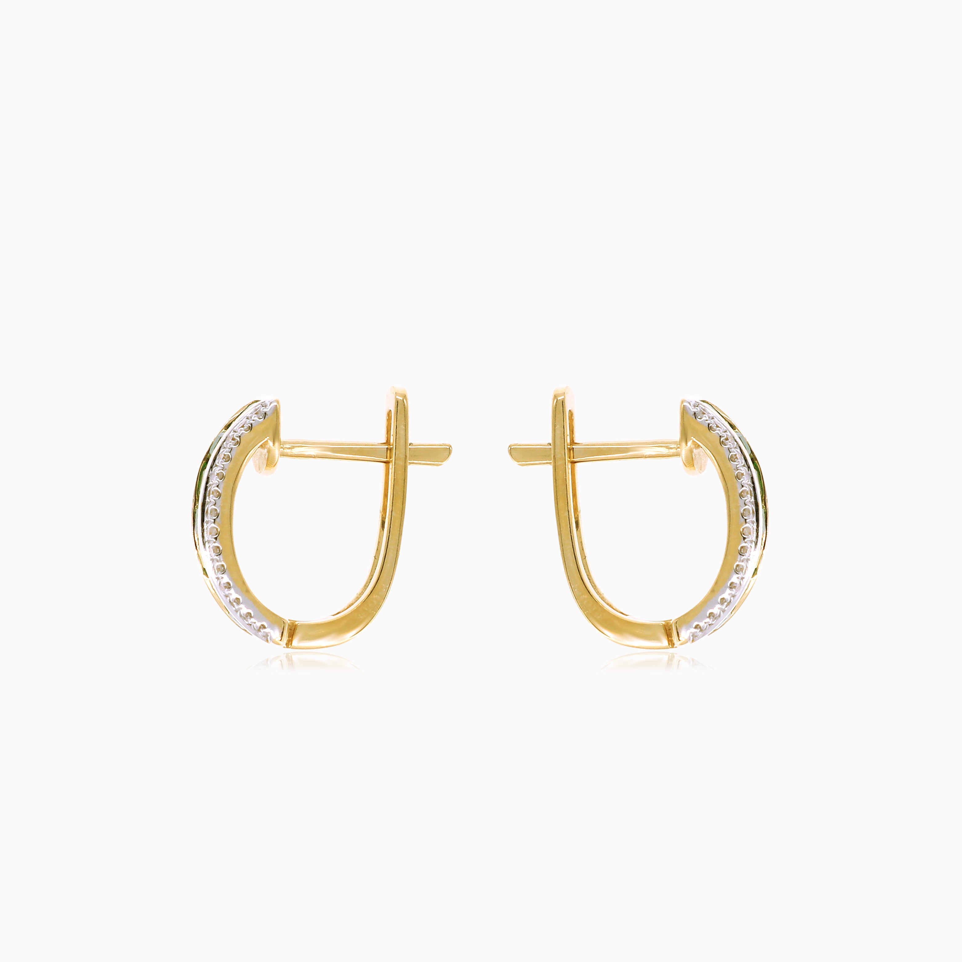 Vylepšete svůj styl těmito úžasnými náušnicemi ze žlutého 14kt zlata s kulatým diamantem jemného stupňovitého brusu a čtvercovým smaragdem ve tvaru princess. Tyto náušnice, zasazené do kanálkového zasazení a zajištěné zapínáním na západku, nabízejí nadčasovou eleganci a sofistikovanost.