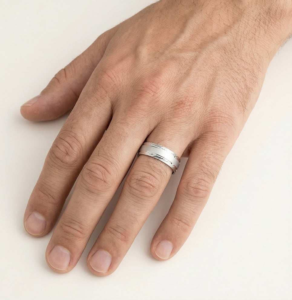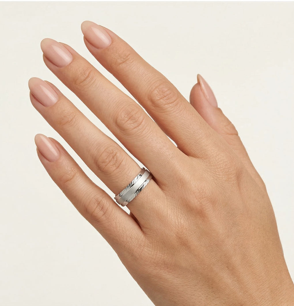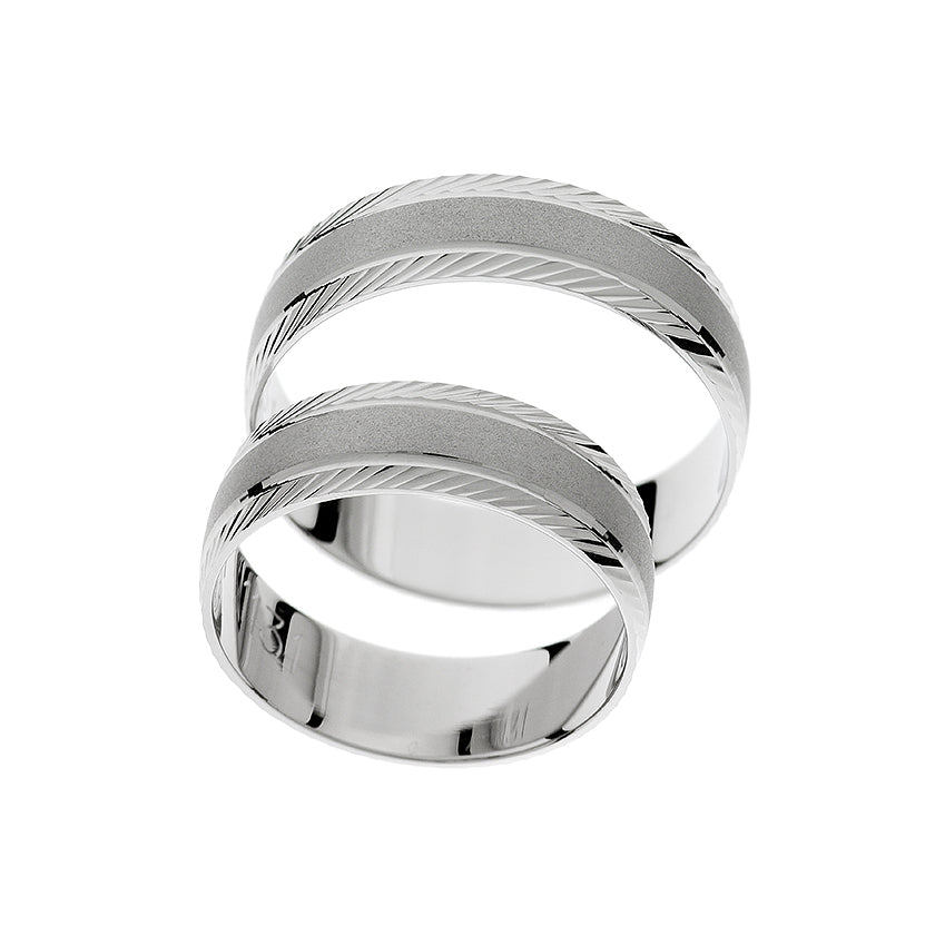 Tento snubní prsten z bílého 14kt zlata je určen pro ženy i muže a nabízí moderní a sofistikovaný vzhled. Prsten je 6mm široký s jedinečnou kombinací povrchových úprav: vysoce leštěný povrch po stranách a matný povrch uprostřed. Tento elegantní kontrast podtrhuje krásu prstenu a činí z něj ideální volbu pro páry, které hledají stylový a zároveň decentní design bez kamenů.