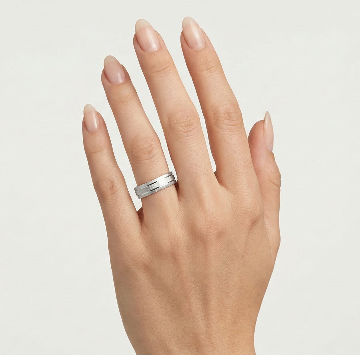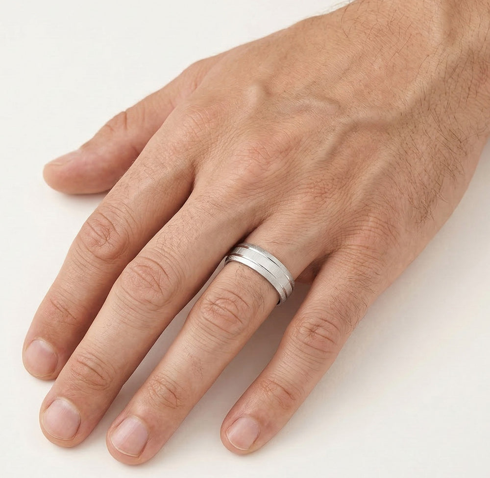Tento snubní prsten z bílého 14kt zlata, vhodný pro ženy i muže je elegantní 5 mm široký . Prsten je vysoce leštěný a po stranách ho zdobí jemné gravírované linie, které vytvářejí rafinovaný a sofistikovaný vzhled. Tento prsten bez kamenů, který je ideální pro ty, kdo hledají klasický a zároveň jedinečný design, vyzařuje nadčasovou eleganci.