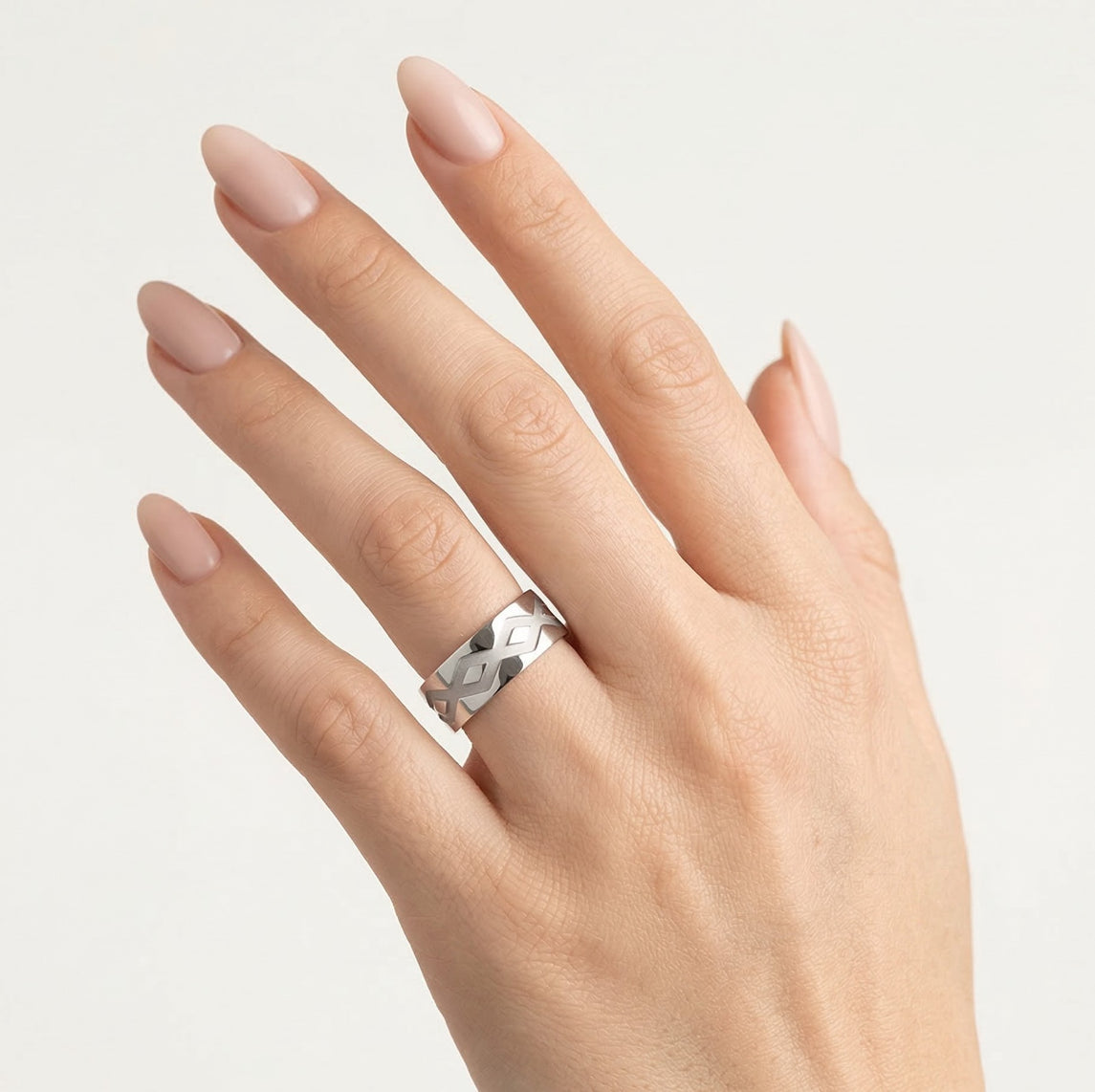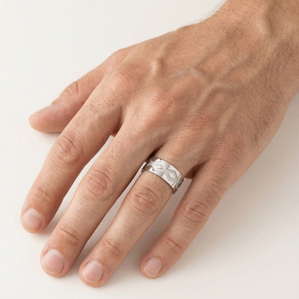 Tento výrazný snubní prsten z bílého 14kt zlata je určen pro ženy i muže a má silný 7mm prsten bez kamenů. Jeho velmi zajímavý design vyniká složitými detaily, které z něj dělají výjimečný kousek. Tento prsten je ideální pro páry, které hledají odvážný a sofistikovaný vzhled, a nabízí moderní pojetí klasické elegance.