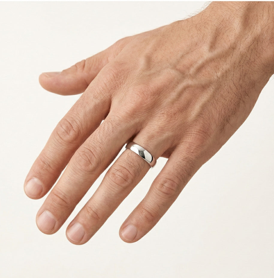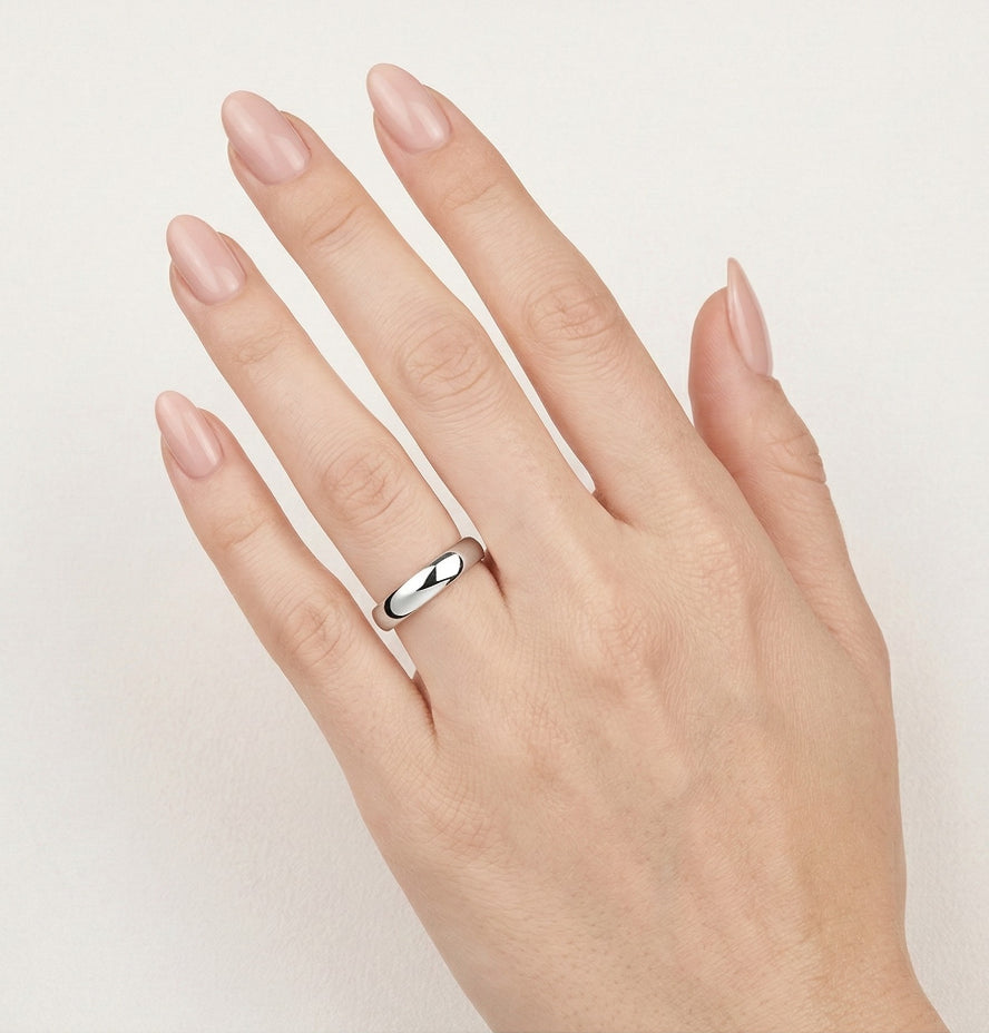 Tento snubní prsten je vyroben pro ženy i muže z bílého 14karátového zlata. Vyznačuje se vysoce leštěným povrchem a klasickým designem bez kamenů, který nabízí nadčasový a elegantní vzhled. S tloušťkou 4,5 mm poskytuje podstatné, ale pohodlné nošení, ideální pro každodenní nošení.