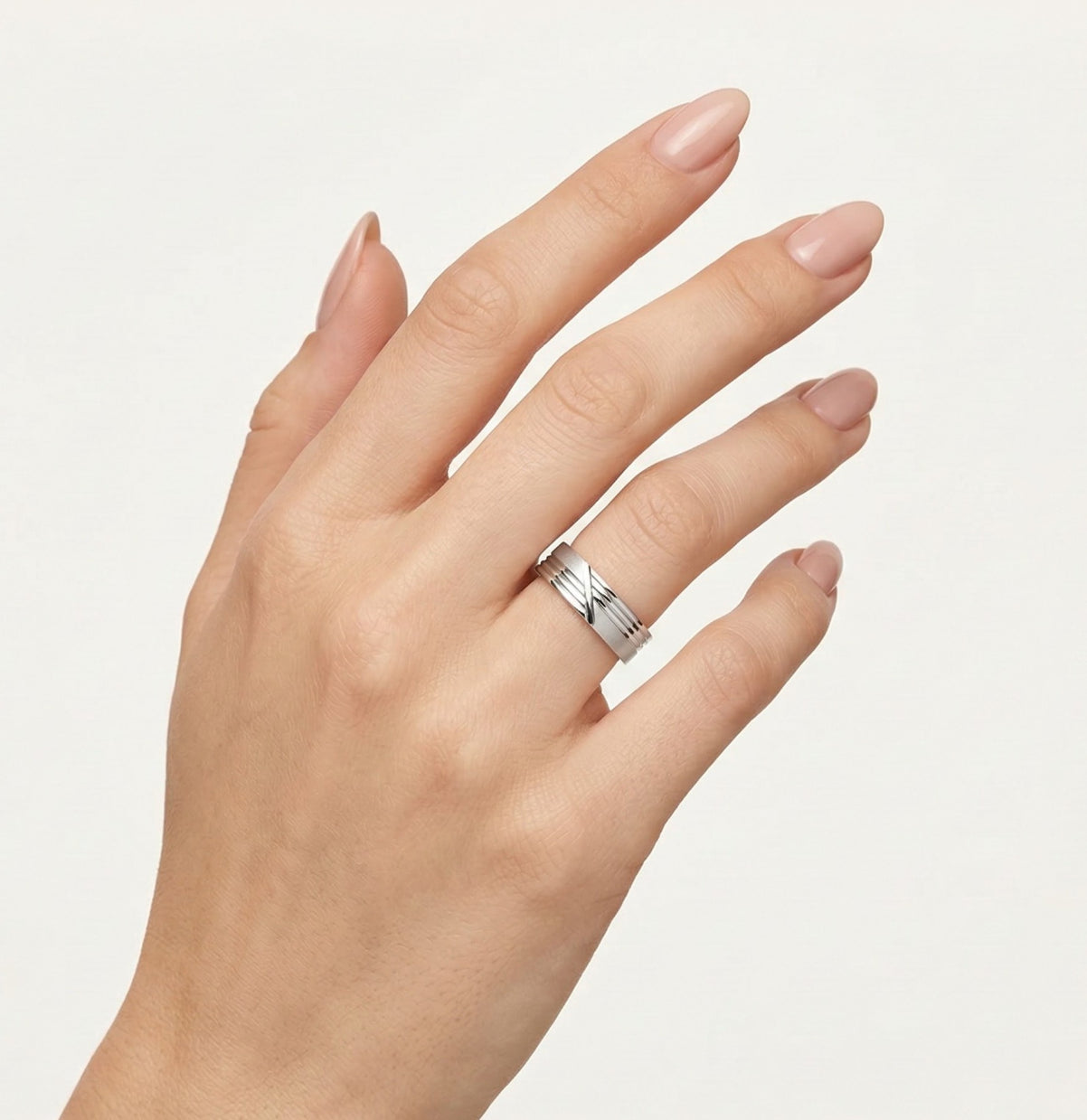Tento elegantní snubní prsten z bílého 14kt zlata pro ženy i muže má leštěný prsten o průměru 6 mm. Design je zvýrazněn gravírovanými liniemi kolem a nad prstenem, které mu dodávají nádech sofistikovanosti a moderního stylu. Tento elegantní prsten bez kamenů je ideální pro ty, kteří ocení nenápadnou eleganci.