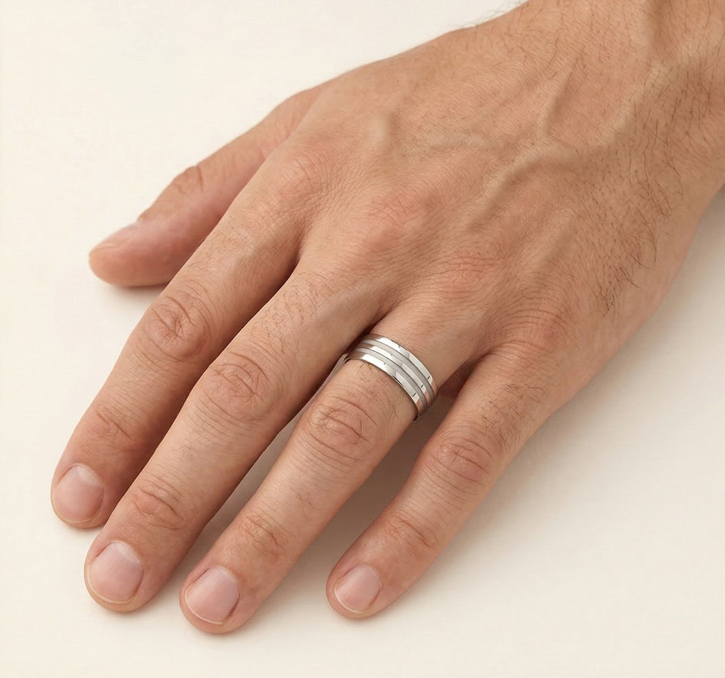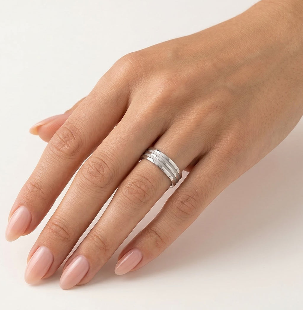 Tento snubní prsten z bílého 14kt zlata, vhodný pro ženy i muže, má elegantní šířku 6 mm a vysoce leštěný povrch. Prsten zdobí elegantní gravírované linie, které vytvářejí stylový a sofistikovaný vzhled. Tento prsten neobsahuje kameny a zdůrazňuje klasickou jednoduchost a trvalý styl.