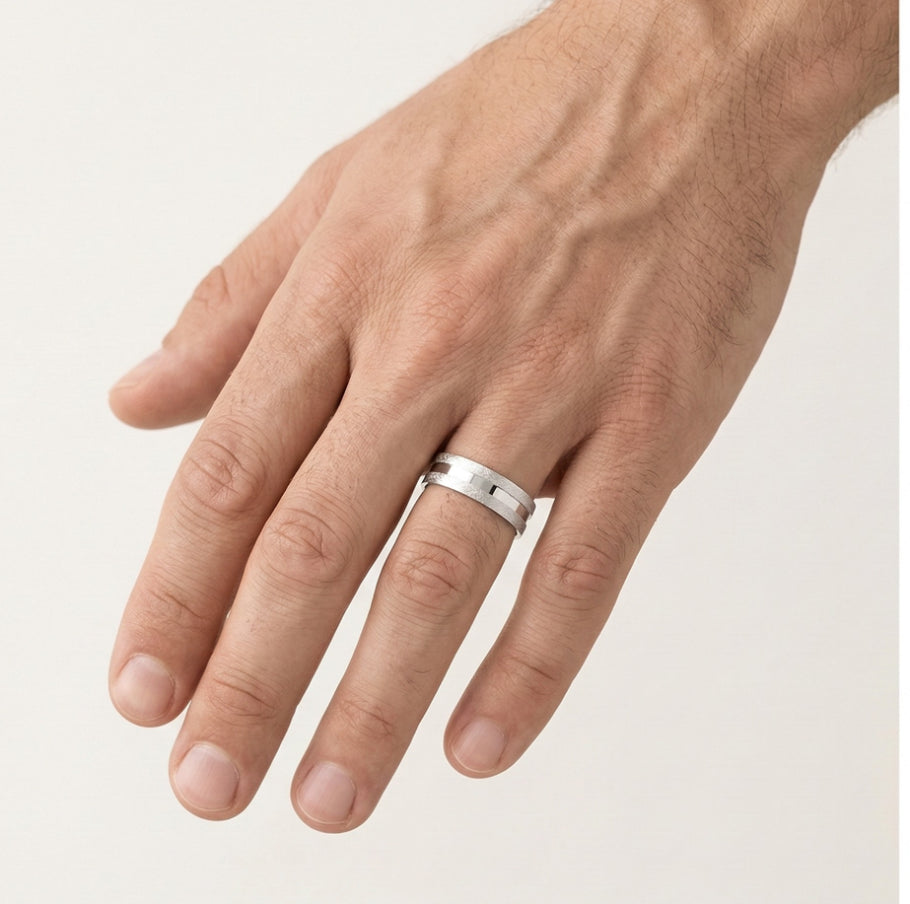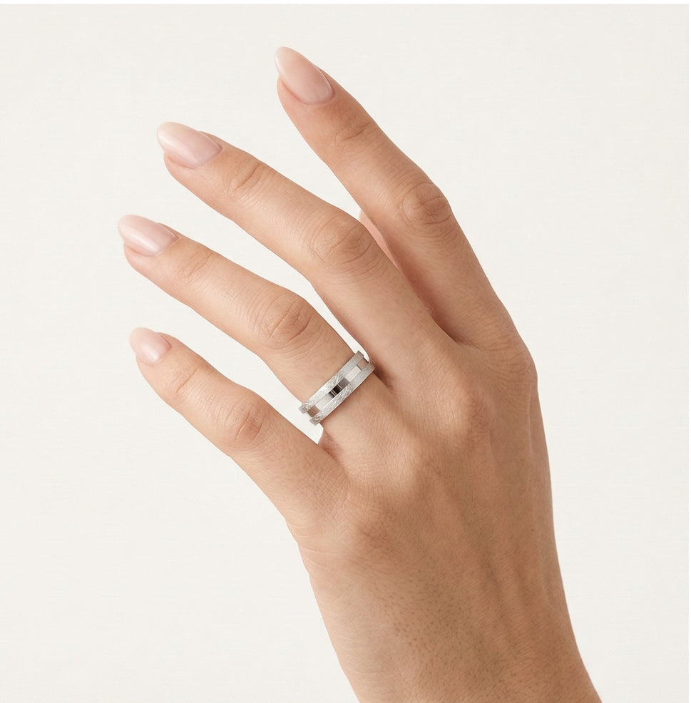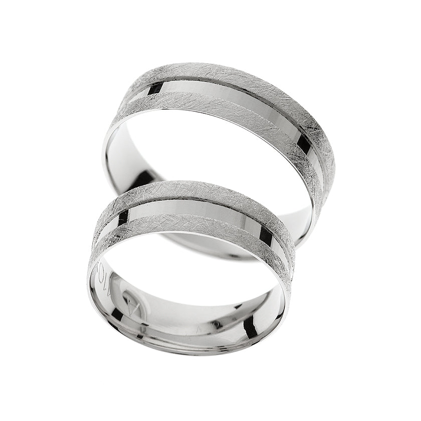 Tento elegantní snubní prsten pro ženy a muže je vyroben ze 14karátového bílého zlata a kombinuje vysoce leštěnou povrchovou úpravu s matným třpytivým broušením pro jedinečný vzhled. Prsten o tloušťce 6 mm nabízí pohodlné nošení a kombinuje klasický design s moderním nádechem, což je ideální pro ty, kteří ocení jemnou sofistikovanost.