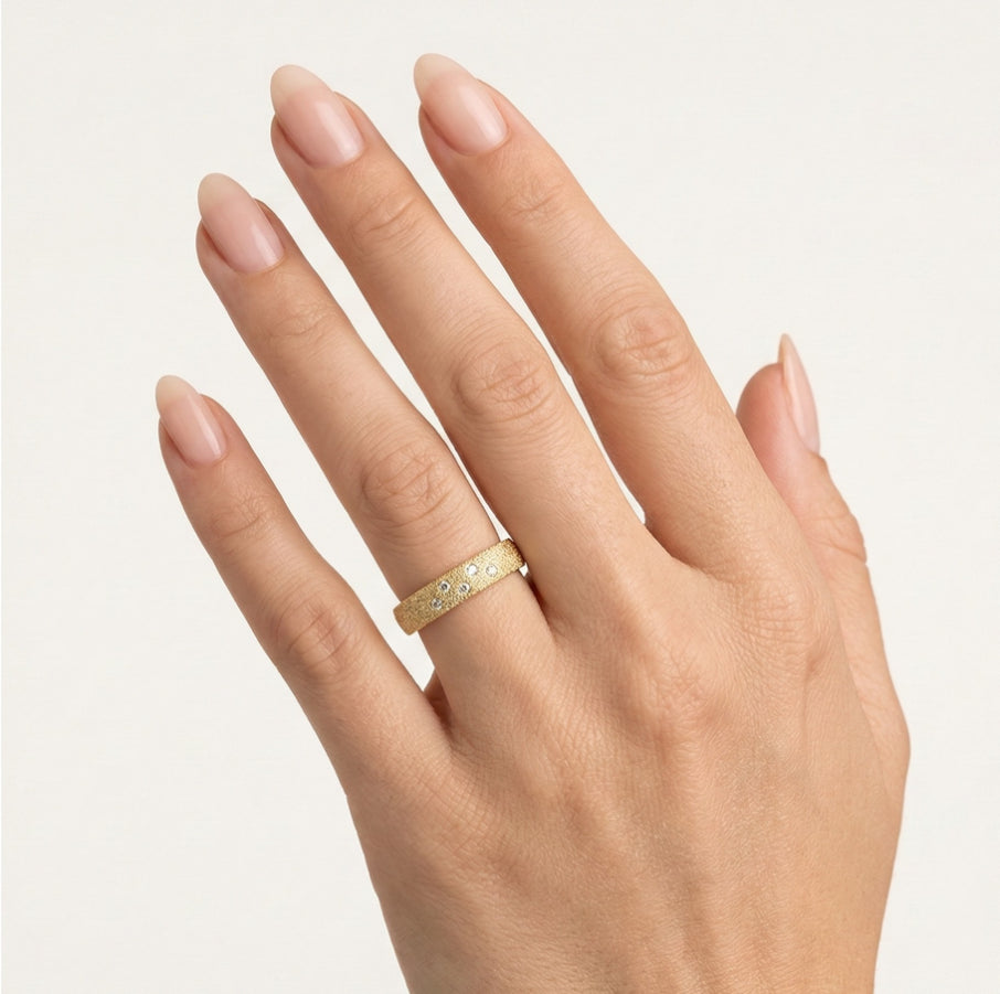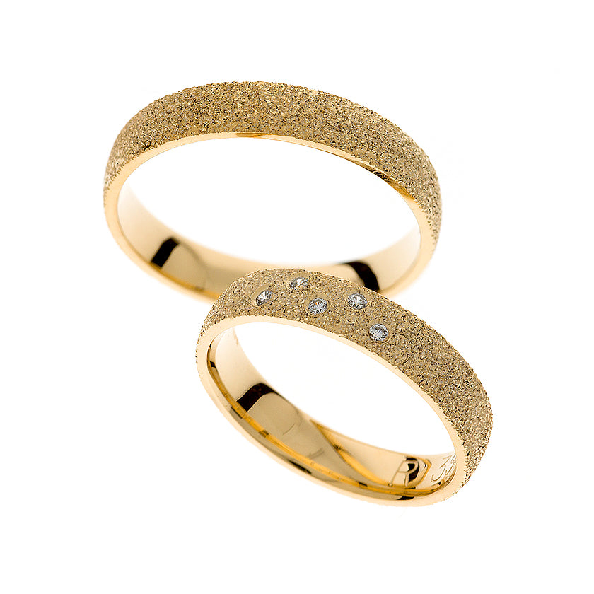 Objevte eleganci našich snubních prstenů ze 14kt žlutého zlata pro muže a ženy s jedinečnou pískovanou povrchovou úpravou. První prsten nabízí volitelný kubický zirkon nebo diamant o celkové hmotnosti 0,05 ct, zasazený v kulatém jemném stupňovitém výbrusu s obroučkou. Druhý prsten je hladký, 4 mm silný, ztělesňující jednoduchost a sofistikovanost.