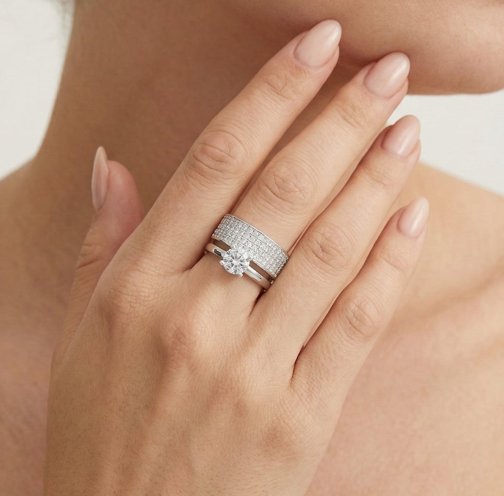Tento stříbrný prsten je tvořen dvěma částmi - solitérním prstenem a páskem osazeným kubickými zirkony. Tyto části tvoří hypnotizující a dechberoucí kombinaci šperků, která Vám dodá eleganci a styl.