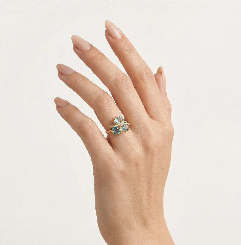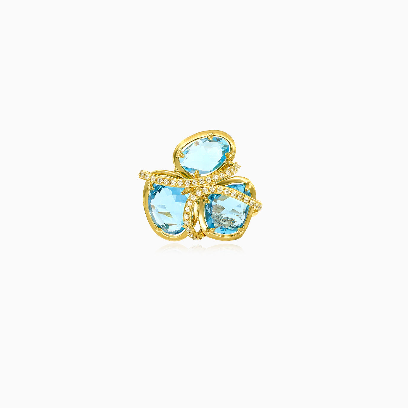 Ozdobte svůj prst tímto nádherným dámským prstenem vyrobeným ze 14kt žlutého zlata. Tento prsten s třpytivými diamanty kulatého tvaru s jemným stupňovitým brusem a třemi úžasnými modrými topasy oválného tvaru s jemným stupňovitým brusem, elegantně zasazenými do bezpečného zářezu, je skutečným projevem elegance.