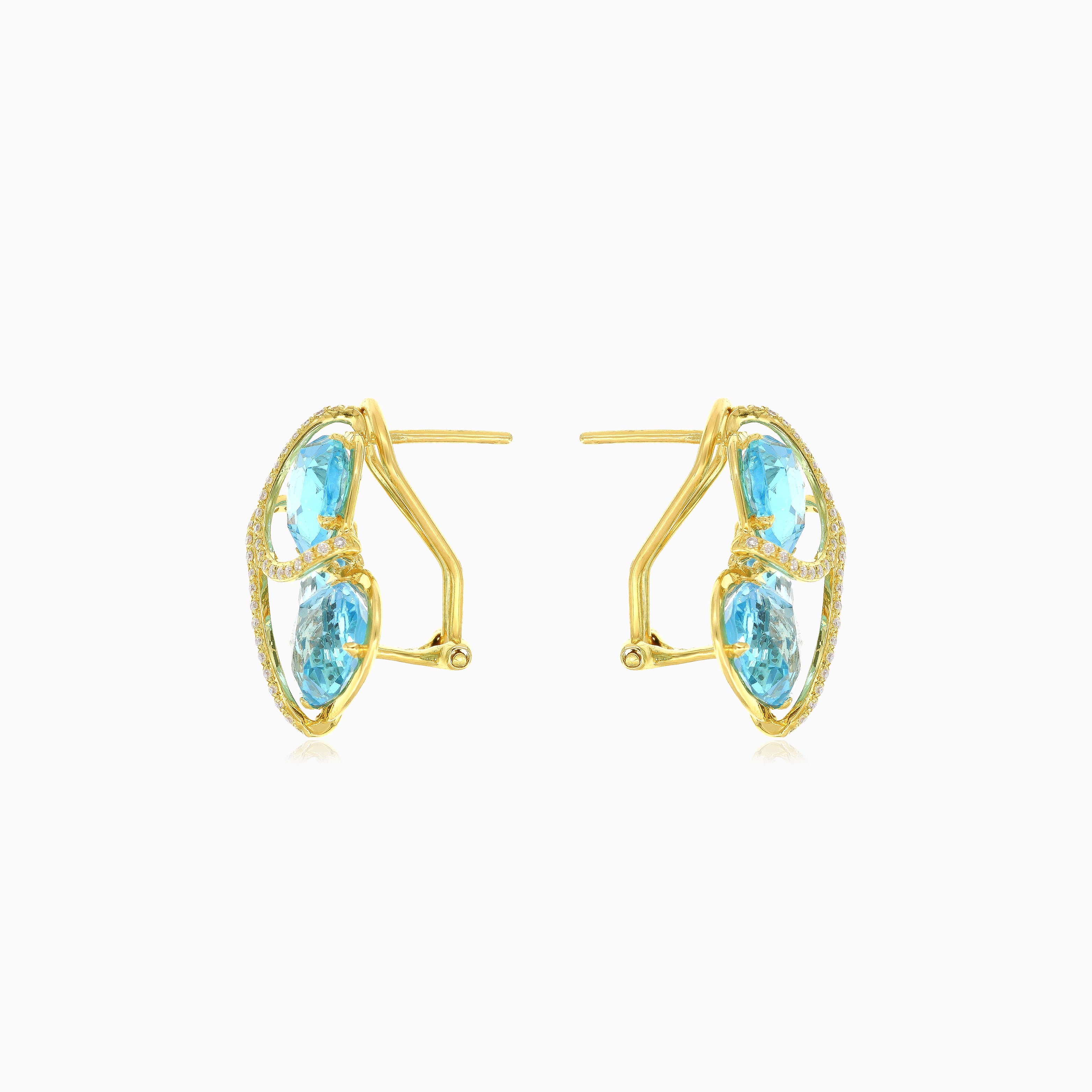 Ozdobte svůj prst těmito nádhernými dámskými náušnicemi ve tvaru kapky vyrobenými ze 14kt žlutého zlata. Tyto náušnice s třpytivými diamanty kulatého tvaru s jemným stupňovitým brusem a třemi úžasnými modrými topasy oválného tvaru s jemným stupňovitým brusem, elegantně zasazenými do bezpečného zasazení s hroty a zapínáním omega back, jsou skutečným projevem elegance.