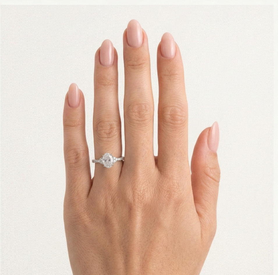 Královský design ve stříbře s velkou centrální oválnou broušenou kubickou zirkonií a zdobení na obou ramenech prstenu kulatou broušenou kubickou zirkonií.
